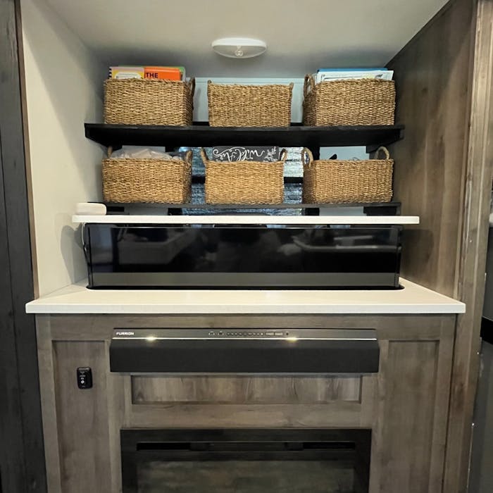 Let’s start with maximizing your space! This can sound daunting, but for us, it fed our creativity and allowed us to add functionality to otherwise dead space in our RV. What is dead space? For us, it was every nook and cranny that had potential to store stuff or the potential to store more stuff than it originally did. Toys, shoes, important documents, food, the list goes on and on. The first step to maximize your space is to walk around your RV and identify all dead space and then brainstorm how to turn it into functional space. Easy enough, right? These were our biggest transformations of dead spaces turned functional spaces: