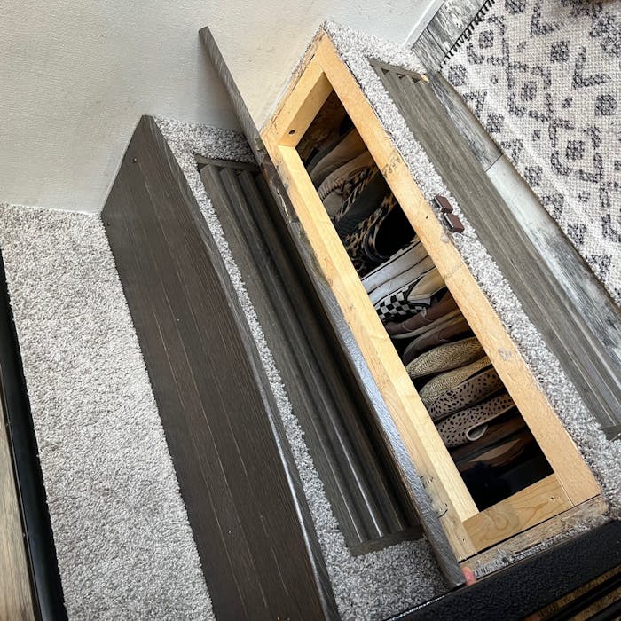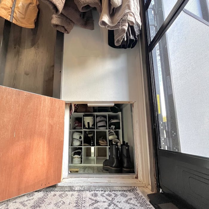 - An empty area in the underbelly storage that can be accessed from inside the RV. Our floor plan allowed us to turn this space into shoe storage that can store our winter and work boots. We cut a hole in the wall, added a door, and tada- even more shoe storage!