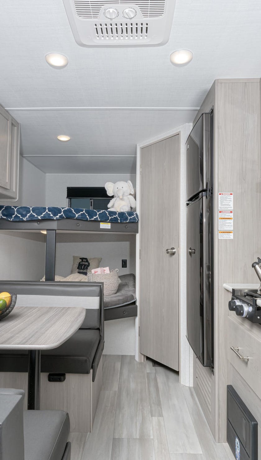 New for all Springdale RVs this year, the 81" ceiling height really opens up this unit and makes it feel so spacious, comfortable, and open. This clever camper manages to deliver a private primary bedroom, separate living space, and a bunk room. With plenty of storage space above the bed, beneath the sofa, and underneath the dinette, there's room for the entire family while on the road, which we know is key.