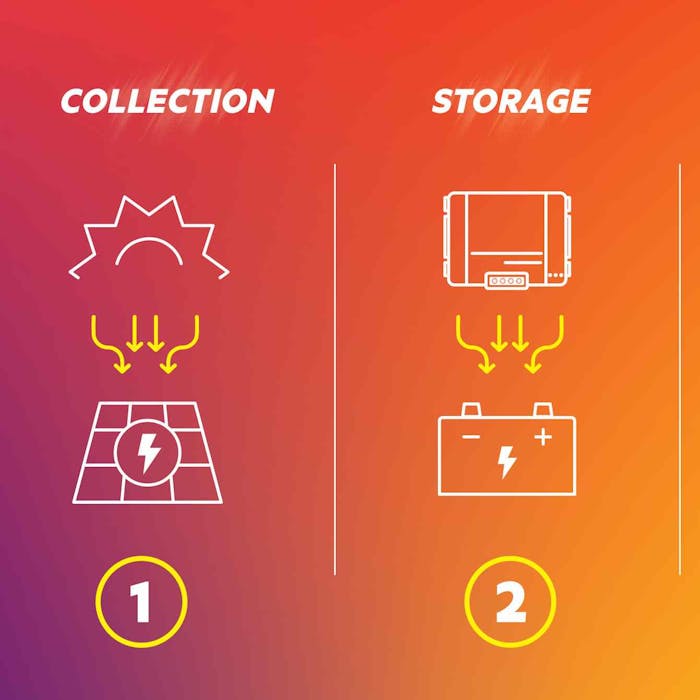 So, if batteries are the the gas tank, then you can think of solar panels as a gas pump. With solar, the fuel comes from the sun. Energy from the sun is collected by the RV's solar panels, sent through a battery charge controller, and stored in your batteries. Anything in the RV that runs on 12v energy can be run on battery power. This typically includes lights, slides, electric stabilizers and leveling, USB ports, vent fans, water pumps and even 12v refrigerators.