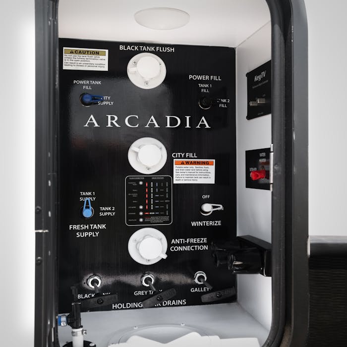As a part of our passion to deliver a better campsite experience, Arcadia has relocated the convenience center from the pass-through storage compartment to a seperate compartment specifically designed for easier access. This eliminates the need to unload the pass through to access the convenience center, it also keeps water out of your storage compartment. No more soggy baggage or potential water damage.