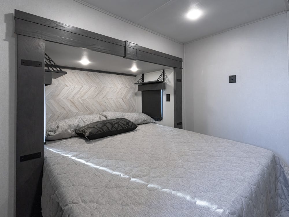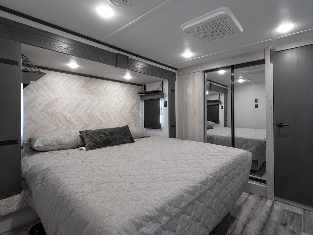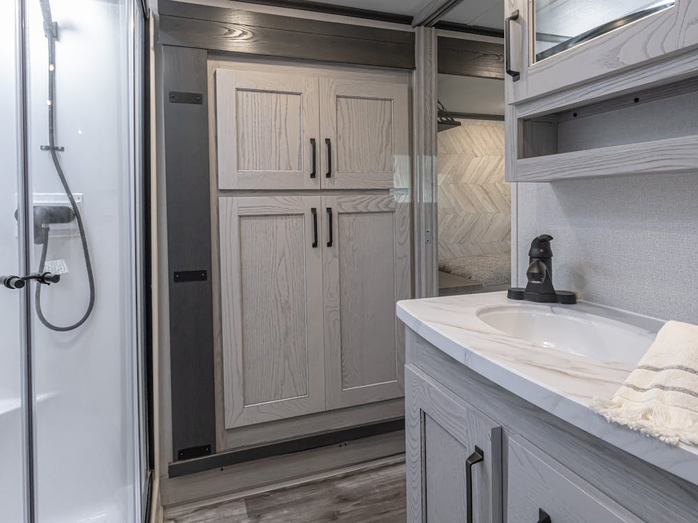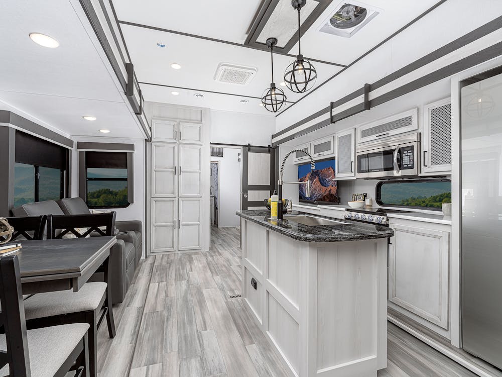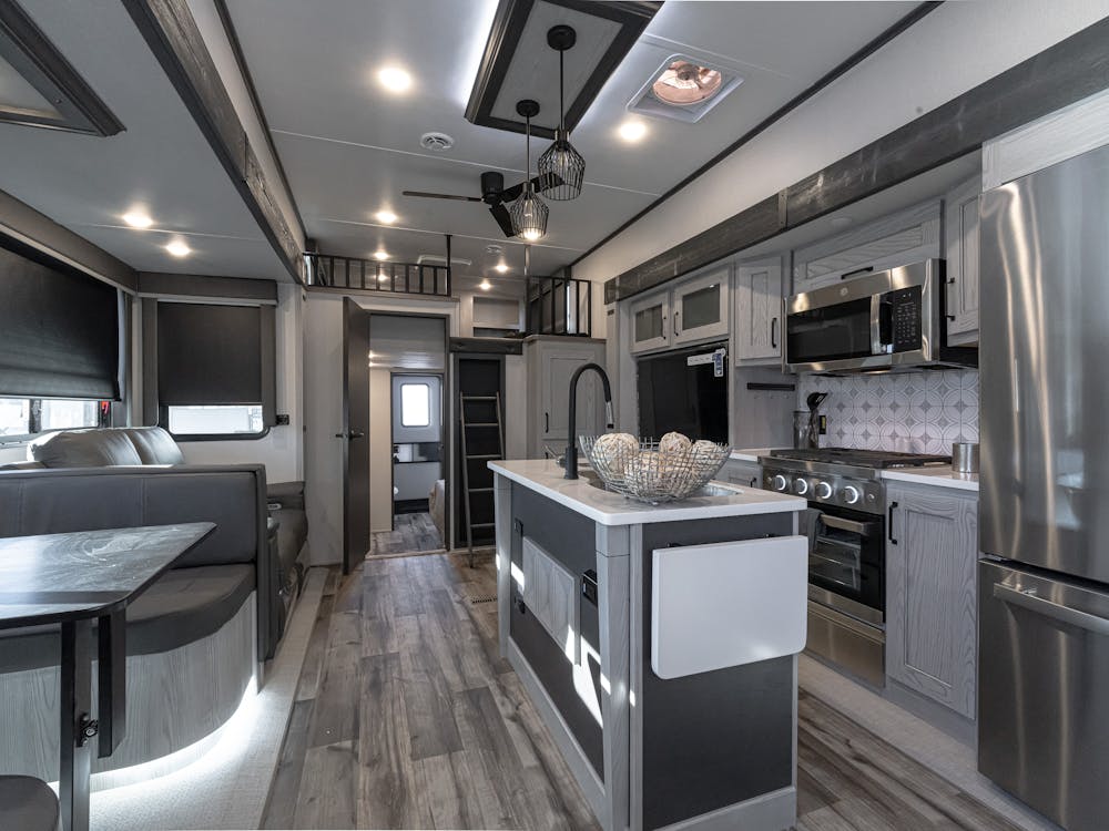 Building on the incredible success Avalanche 390DS, introduced in 2022, the rear suite of Alpine’s 3912DS eliminates that model’s loft, delivering a second suite with a full-height ceiling and a full-width bath. Former Alpine product manager Dustin Tavernier designed the floor plan and said that the taller ceiling gave his team an entirely new canvas with which to work.