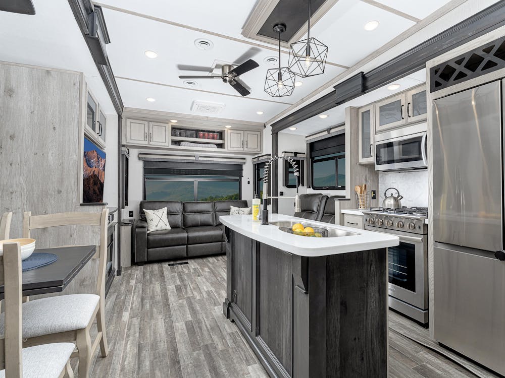 For 2023, Montana raises the bar with the high-impact items you’ll see across all of their models; including the Furrion 24” stove with matching stainless steel drawer, a 35,000 BTU furnace, and a 16-gallon gas and electric water heater. Strategically placed inverted outlets throughout the RV are one of many thoughtful details for which Montana is known. Perhaps the most new and exciting feature is the two smart TVs you'll find inside. The outdoor kitchen features a Keystone exclusive adjustable 23” dual burner Suburban Griddle that allows owners to adjust the cooking surface down to a more comfortable height.