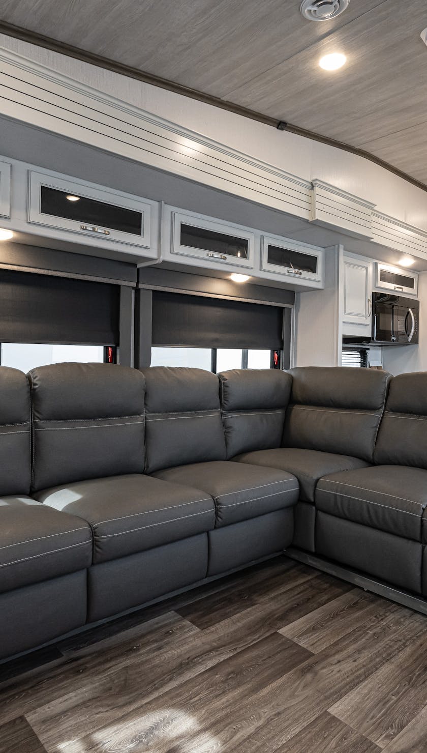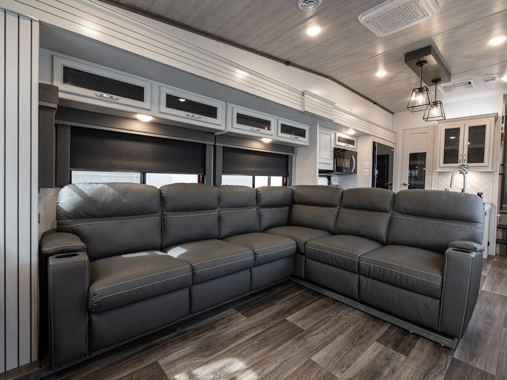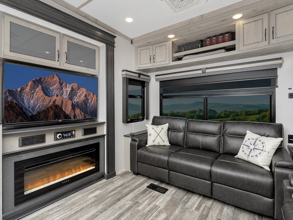 The 320RDS is an exciting new design that simply, “makes sense.” This 36’ 4” half-ton model was created for the extended stay RV’er and those adventuring across the country. This floorplan combines a dream kitchen with a newly designed rear den. The giant L-shaped lounge includes two theater recliners & a king tri-fold sleeper sofa. The 320RDS maximizes campsite views with oversized windows and a motorized lift that hides the television when not in use. The bedroom suite features an optional king bed, a large walk-in shower, a full-height wardrobe, and a closet with stackable washer/dryer prep.