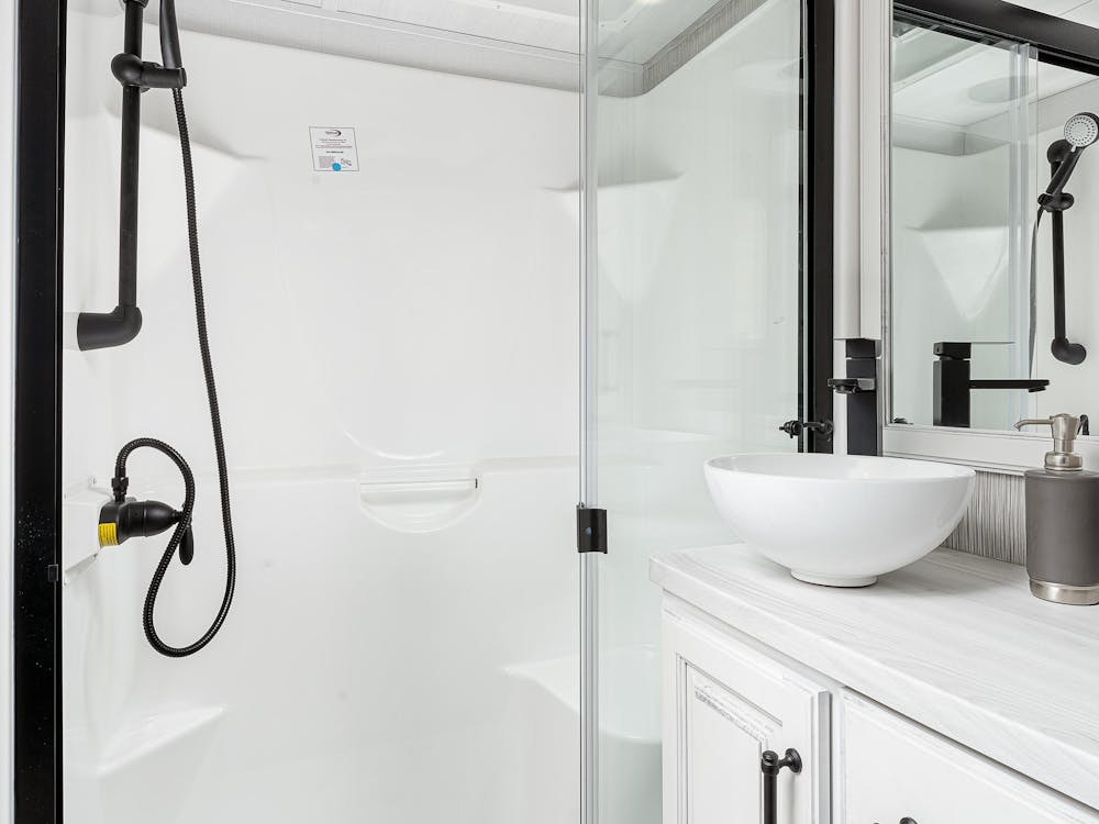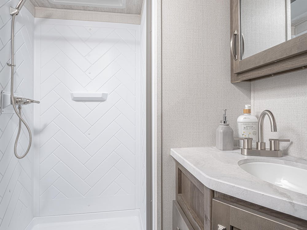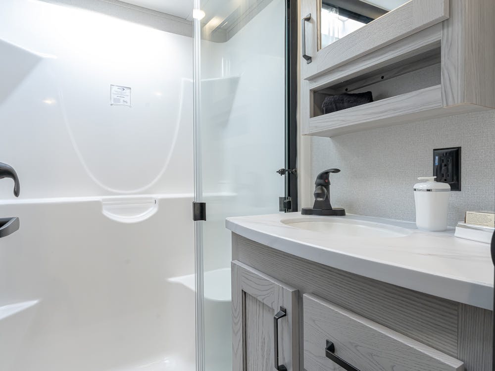 The ceiling height in the shower may be even more noticeable, soaring more than 7’ and topped with a skylight. Other notable additions to this model include the much-loved butler’s pantry, borrowed from Alpine’s 3712KB, a new vestibule bench with shoe storage, coat hooks and decorative backlit glass panel. This new entryway design will also be featured in the new Alpine 3102RL and Avalanche 312RS models.