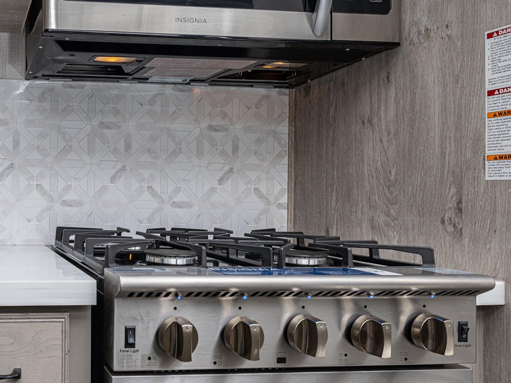 This kitchen is made with those little touches in mind; with two large drawers on the left when you enter. The top drawer has a unique silverware/utensil drawer with removable dividers for flexible storage. A hidden pantry door is supported with gas struts. This stops the door from swinging open when the unit is not level. The pantry has some surprising features you won’t find anywhere else: an A/C duct to keep the area cool, an overhead light switch so you’re not searching around in the dark, and it also has a 110v outlet so that you can plug in your small appliances or rechargeable vacuum.