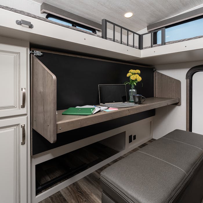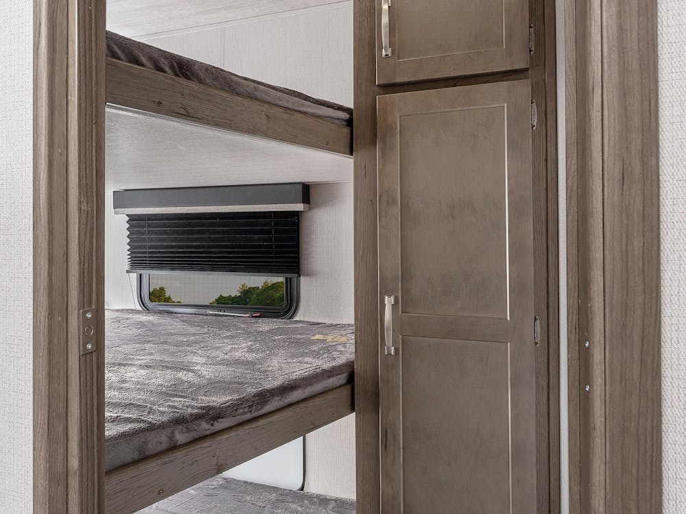 While some of Cougar's competitors offer a smaller bunk fifth wheel, none of them will be able to match Cougar's unique bunk room features & living room design. This floor plan was created with families in mind, however, more and more customers are asking for a versatile separate room that can be used in various ways. The private bunk room in the 29BHL offers sleeping for 4. Additionally, the full-size lower bunk can be turned into a small office with the all-new Murphy Desk.