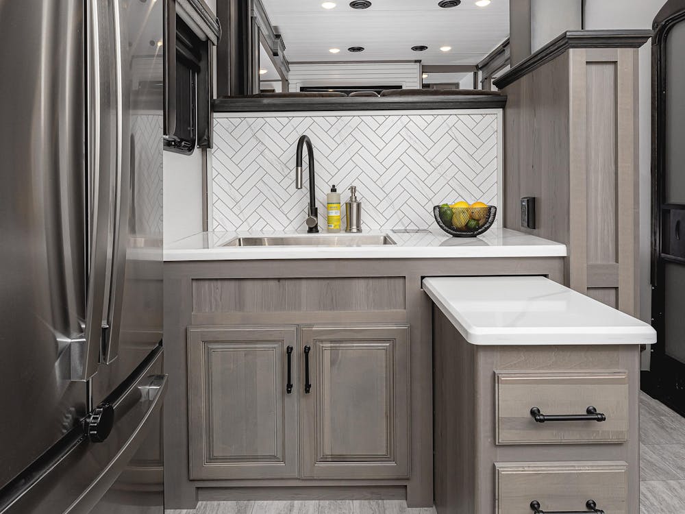 True to its “luxury is not an option” tagline, Alpine fifth wheels are equipped with Best Buy’s Insignia range and cooktop (which can be serviced by the retailer), an 18 cubic foot residential Samsung refrigerator, hardwood cabinets, and solid surface countertops.