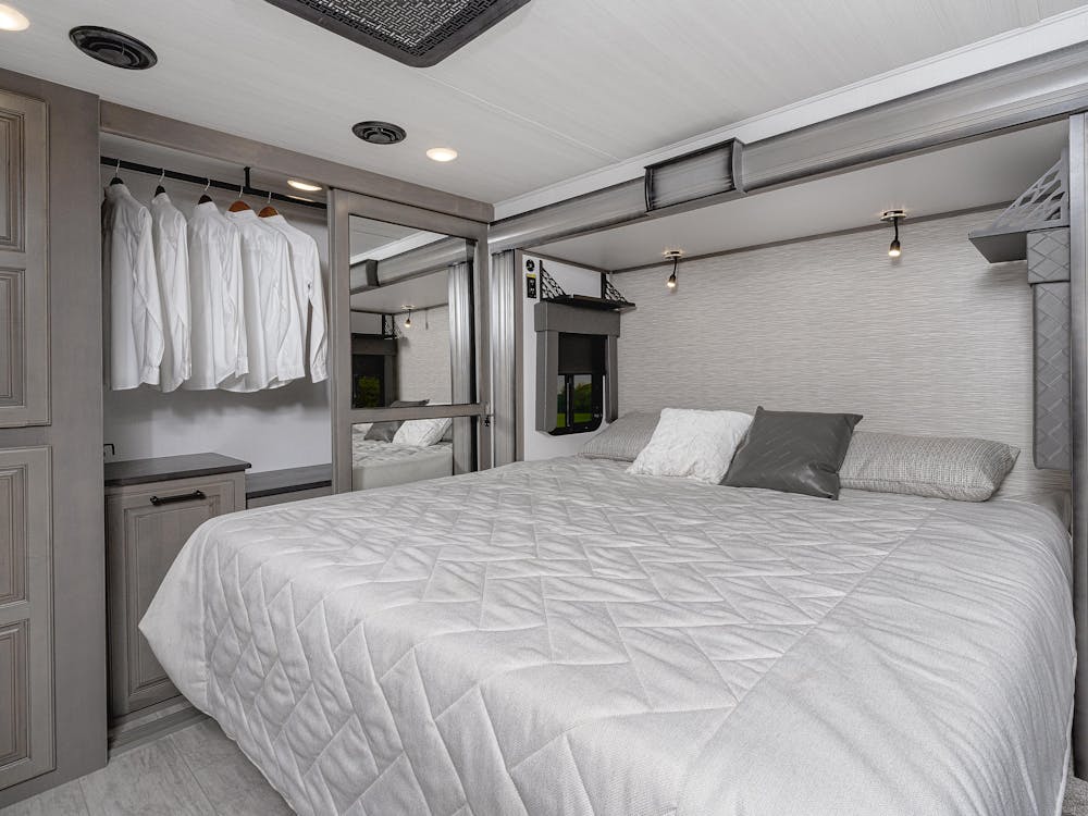 The primary suite takes advantage of High Country’s extended bed slide, adding a huge bathroom closet with W/D hookups and placing a wide dresser with flanking wardrobes underneath the fan-favorite panoramic front windshield.