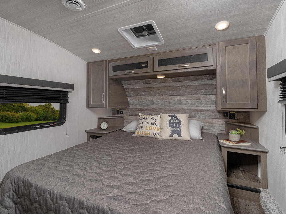 Made to be a little smaller than most Cougars, the 2100RK features a rear kitchen and a master suite with a bath. It may be on the smaller side, but you can still sleep up to 6 people in this camper. And there’s still plenty of storage to be found. Right when you come in there is a shoe cubby underneath the booth dinette. In the kitchen, there are about 10 drawers and cabinets to store whatever you need, and the pantry is nice and deep so that you can pile in as many things as you want while you’re out camping and not have to worry you need to go get more snacks constantly.