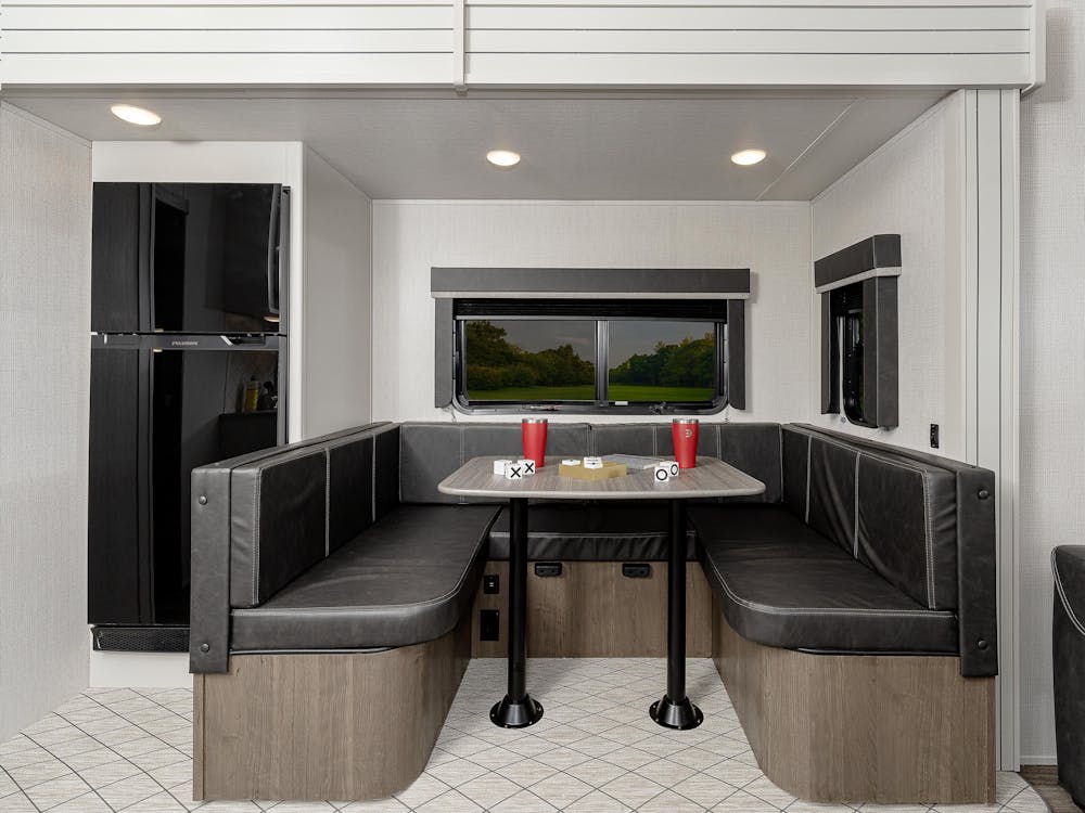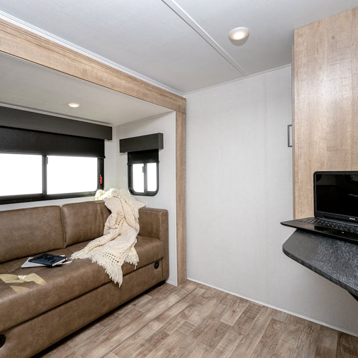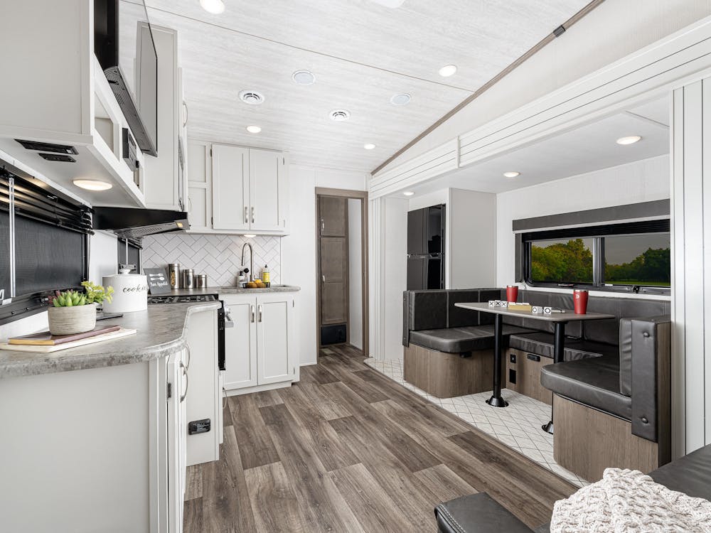The 29BHL was inspired by both the 24RDS couple’s Half-Ton 5th wheel and the 30BHS bunkhouse Half-Ton travel trailer. Like its sister models, the 29BHL's living area is the ultimate in versatility. A bench ottoman with storage can provide extra seating at the dinette or can shift in front of the sofa where it is a footrest. Similarly, the freestanding dinette table can be placed next to the sofa as a TV tray or coffee table, be used in the kitchen for extra counter space, or be taken outside for campsite entertaining.