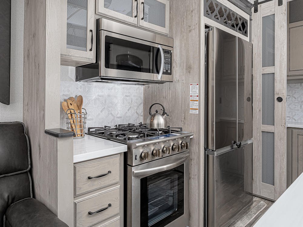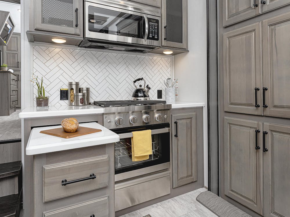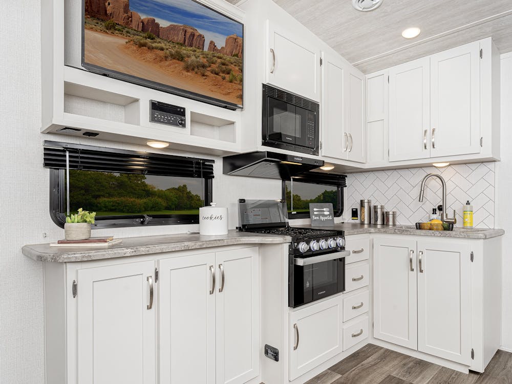 With Montana High Country, you’re still getting the exclusives you get with Montana, but in lighter, shorter models at more attainable price points. The Montana High Country 311RD has a conversation-friendly, U-shaped kitchen overlooking an open-concept living/dining area. An all-new entertainment center design has gorgeous, back-lit cabinets, SMART TV, and a fireplace, which is exceptionally uncommon in a 35’ coach. The kitchen’s Snow Powder LG solid surface countertops show off a 24” Furrion stainless steel stove with a matching drawer in front of a lively black and white medallion backsplash.