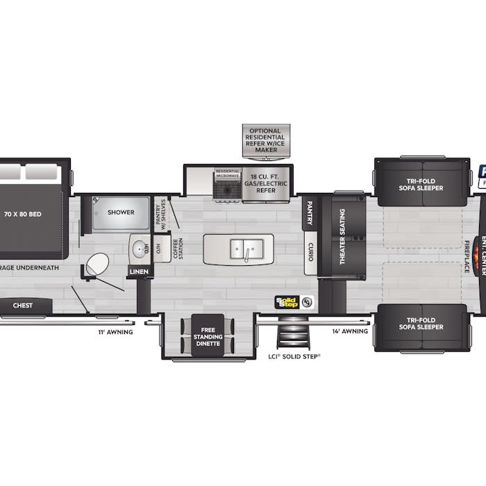 WHAT’S EXCITING: A front living floor plan with three levels of separation and a slide-out tray for extra storage options.