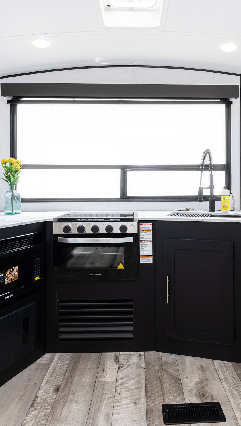 For 2023, Montana raises the bar with their high impact items you’ll see across all of their models; including the Furrion 24” stove with matching stainless steel drawer, 35,000 BTU furnace, and a 16-gallon gas and electric water heater. Strategically placed inverted outlets throughout the RV is one of many thoughtful details for which Montana is known. Perhaps the most new exciting feature are the two smart TVs you'll find inside. The outdoor kitchen features a Keystone exclusive adjustable 23” dual burner Suburban Griddle that allows owners to adjust the cooking surface down to a more comfortable height.