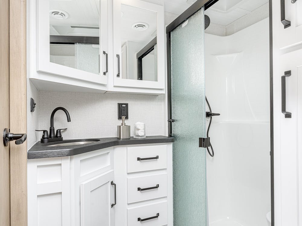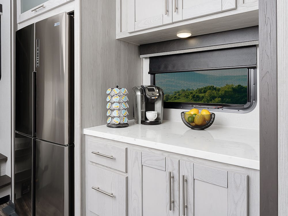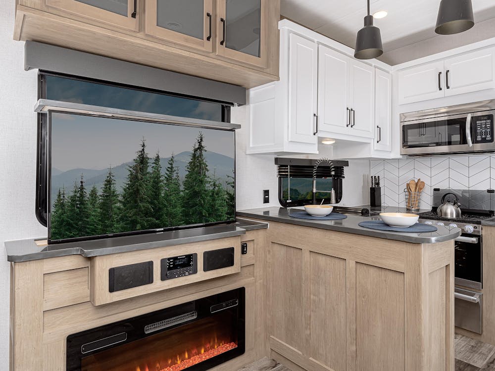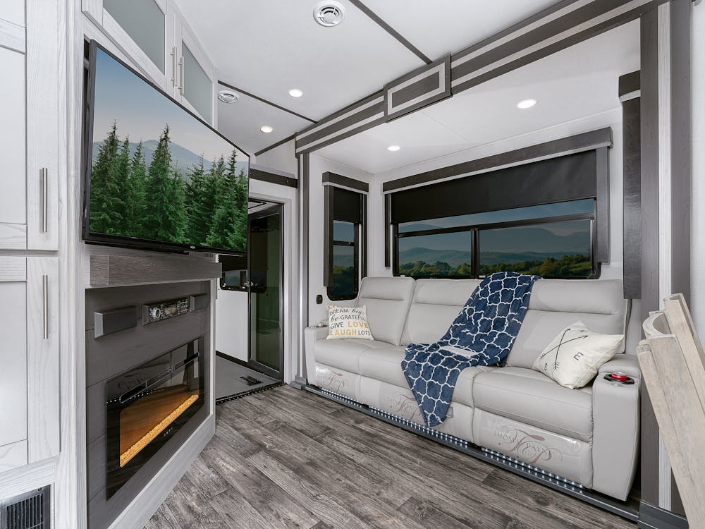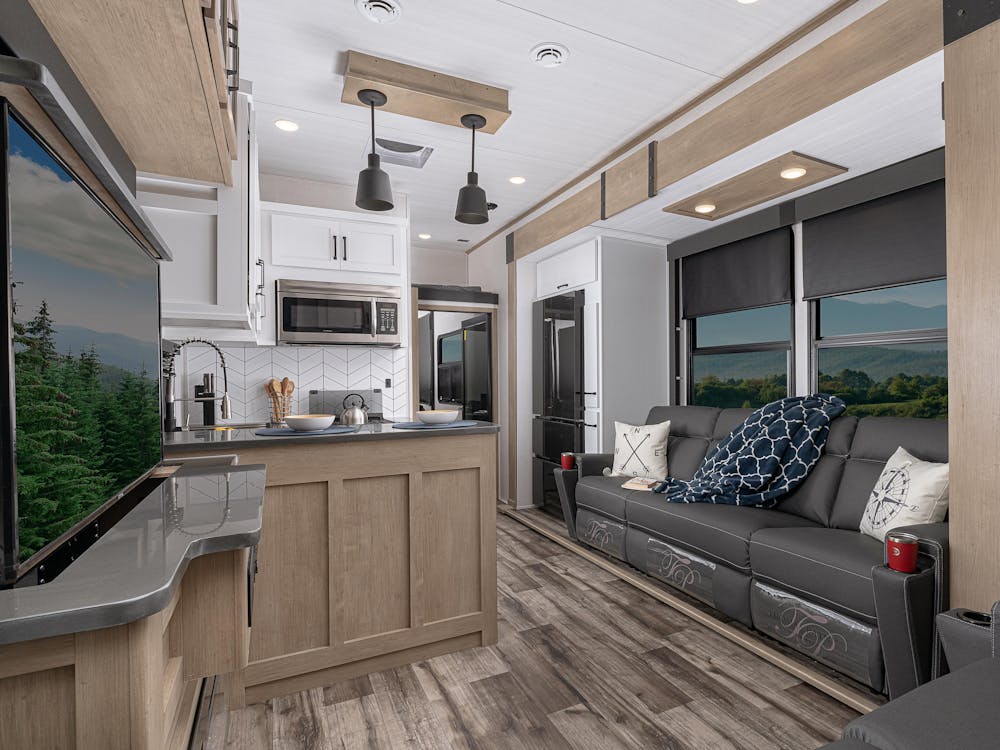 In the main living and kitchen area, owners get the luxury of Thomas Payne® cross-conversational reclining seating that has a great view of the campsite when the elevator TV is down and the TV when it is up. This entertainment center also features an electric fireplace for owners to warm up on chillier adventures. The u-shaped kitchen provides ample storage and counter space and features a three burner cooktop, convection microwave, and, new for 2023, all Raptors now come standard with a 16.5 cubic foot 12-volt refrigerator which pairs perfectly with the Keystone exclusive SolarFlex system and optional Dragonfly lithium-ion batteries.