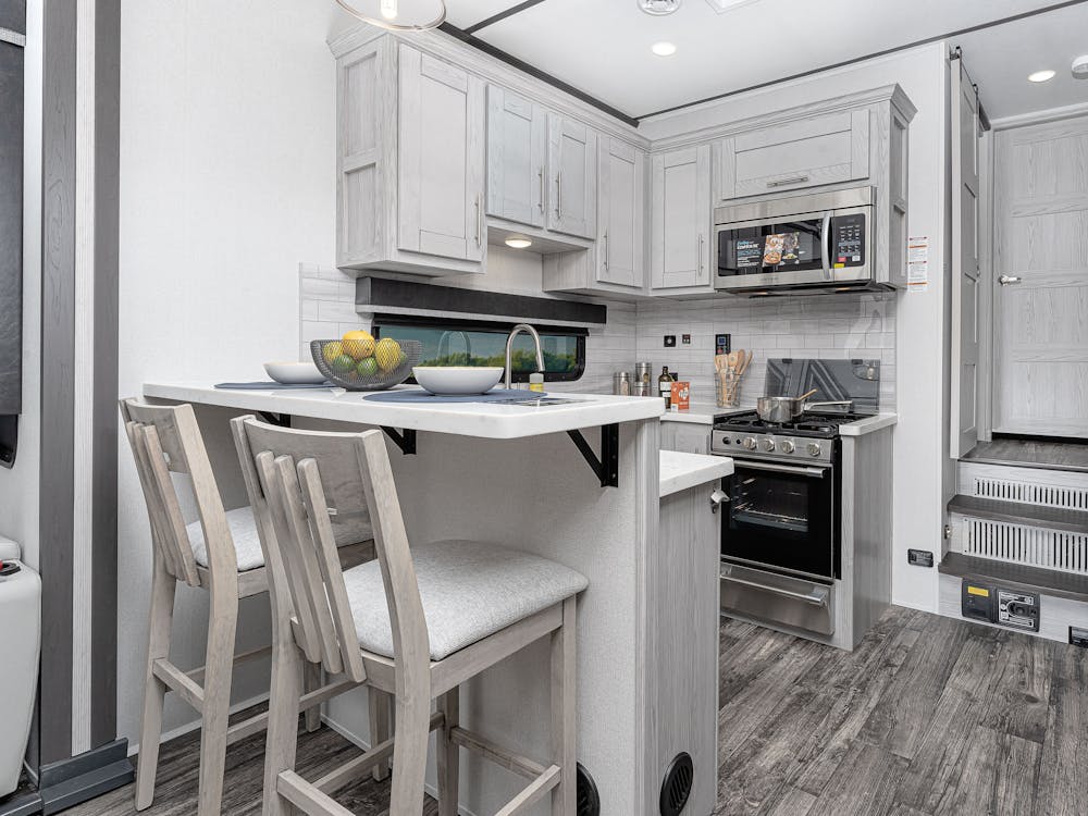 WHAT’S EXCITING: The ultimate outdoor party kitchen and a true chef-style kitchen in a Toy Hauler that features high-top bar seating!
