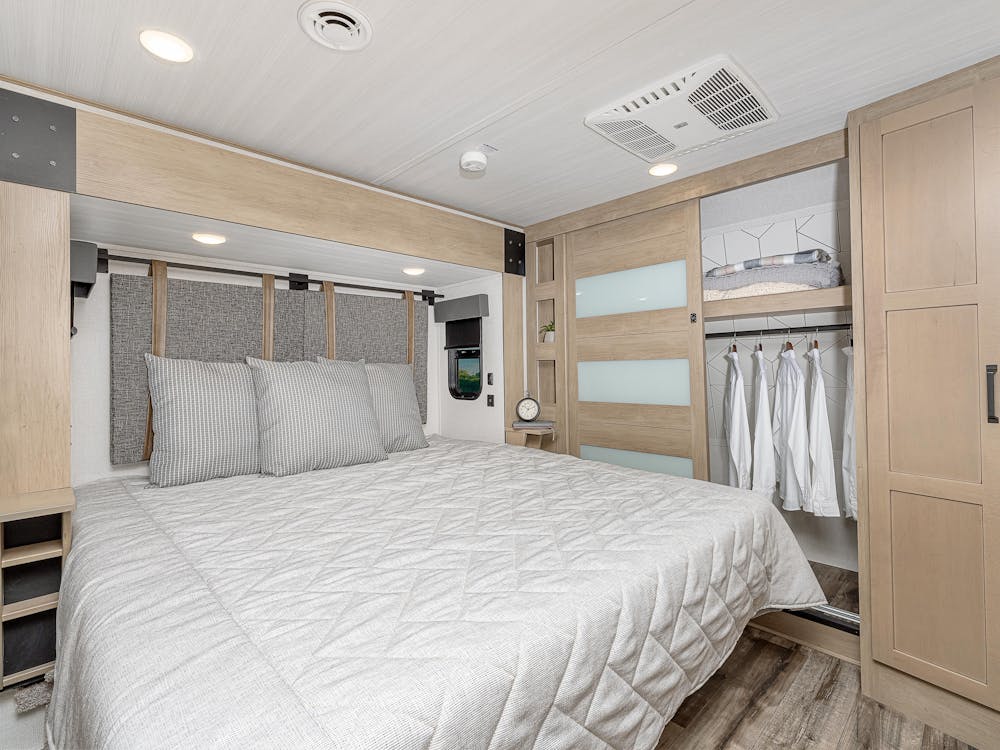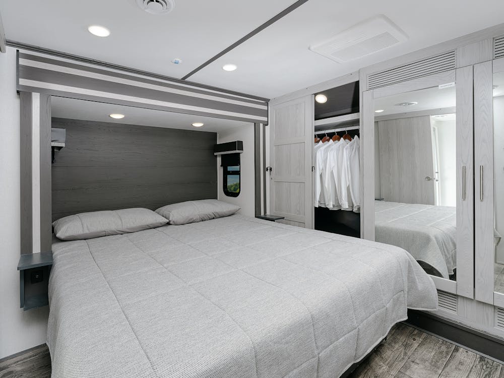 All 2023 Fuzion and Fuzion Impact fifth wheels now come standard with a king-sized bed. Let's not forget the Keystone Exclusive SolarFlex™ system that comes standard on every floor plan in the Fuzion line-up. Fuzion owners have the choice between the standard SolarFlex™ 200 package, the optional SolarFlex™ 400i package, and the optional SolarFlex™ 600i-L package. Dragonfly Lithium Batteries are also now standard equipment on all 2023 models. Make sure that you stop by and see this floorplan to see Fuzion’s all-new and exclusive garage bar.