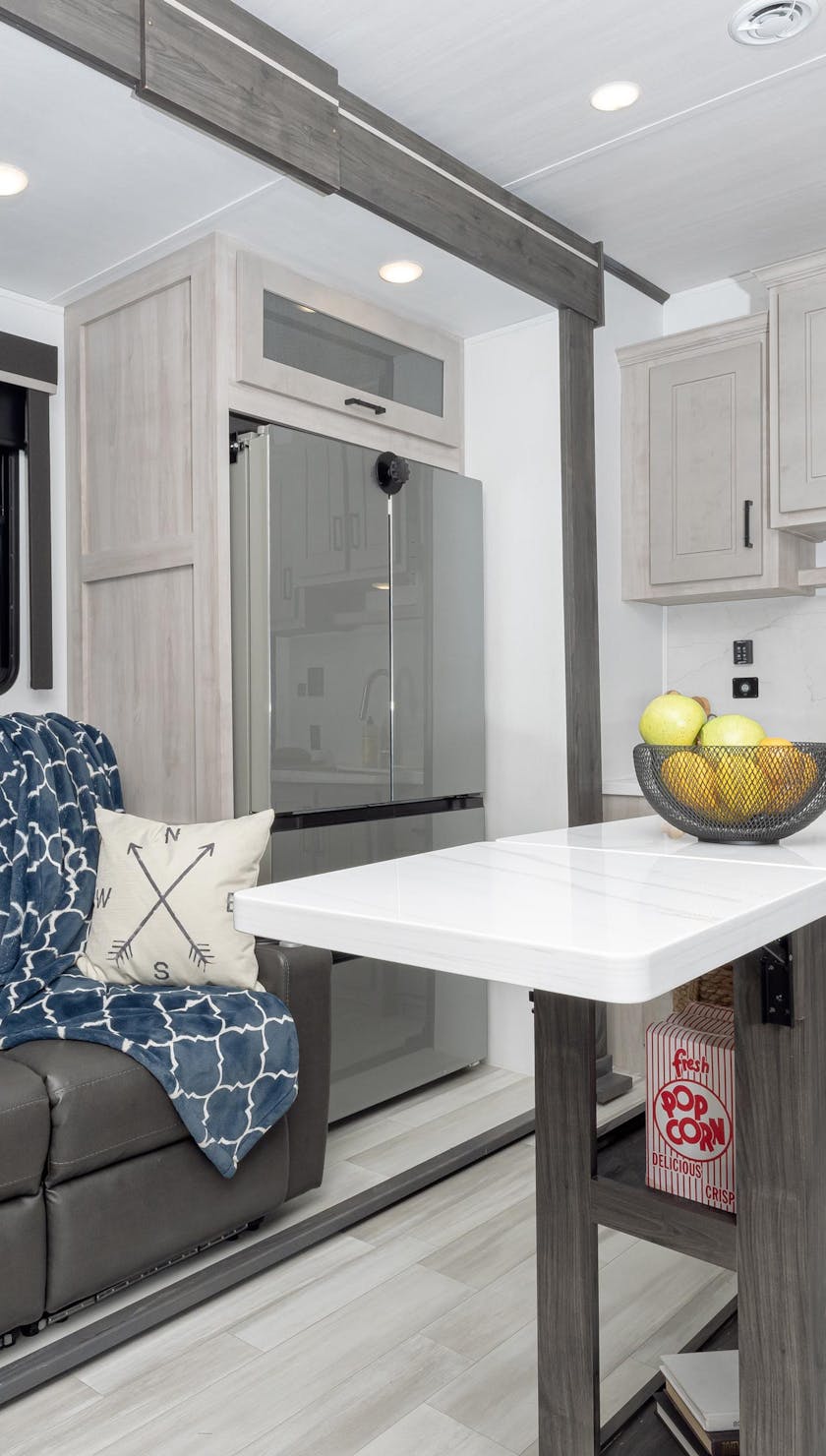 When you're ready to go big, you go Raptor 428. Sporting the largest garage in the lineup, this beast also features a bar-height cocktail table and two heated, massage recliners with USB chargers. Raptor 428 also goes big with storage with a huge pantry, overhead cabinets, and top-of-the-line Insignia appliances, including a 24" oven.