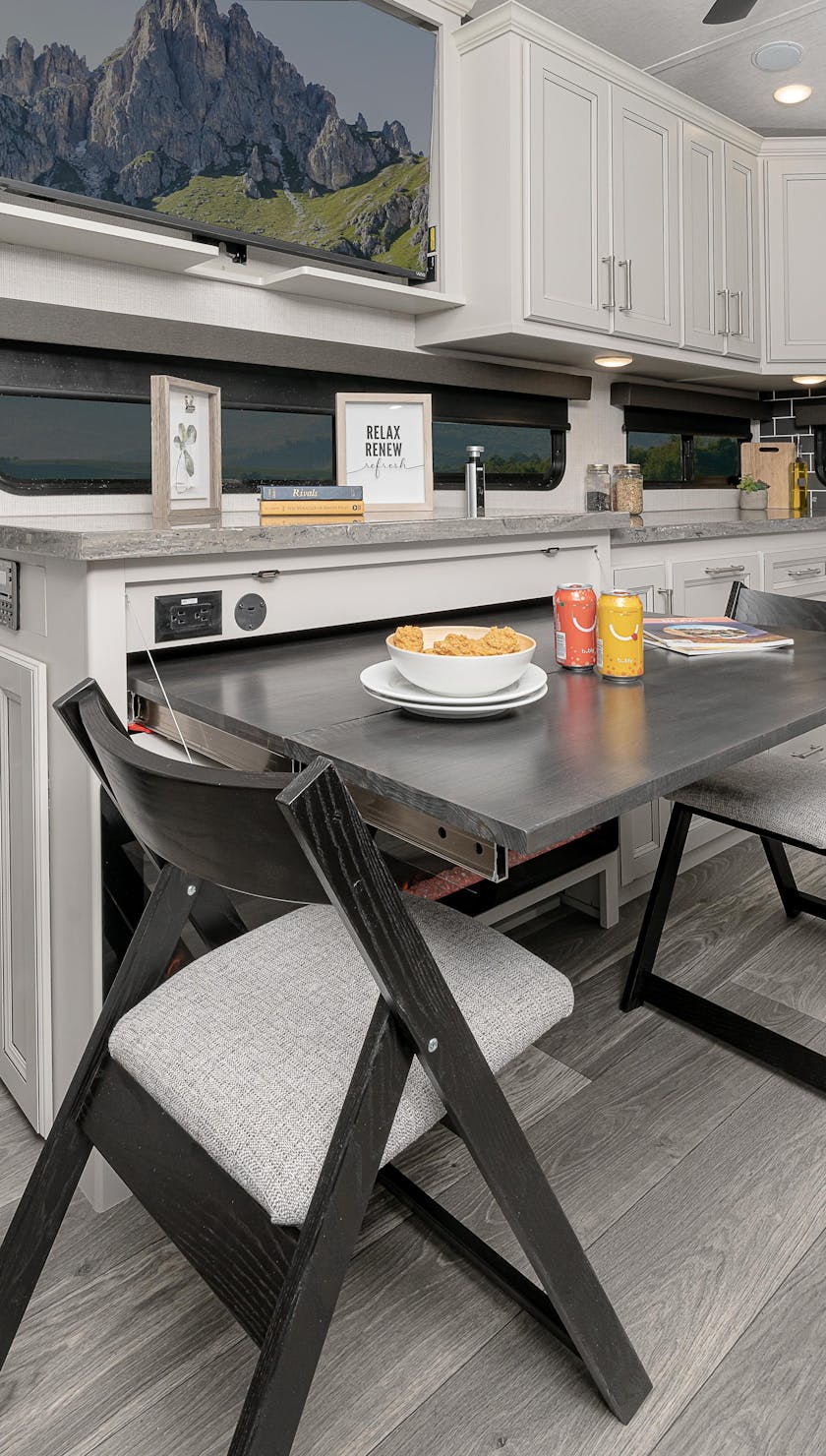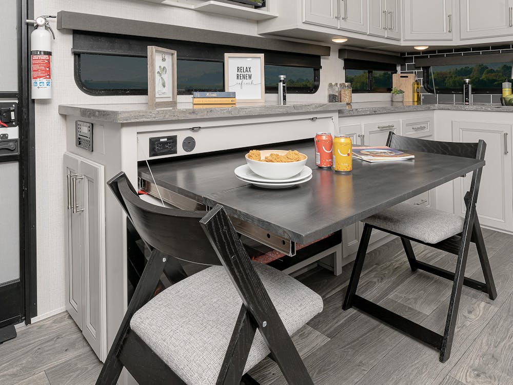 From hidden tables to multifunctional dinettes, convertible sleeping spaces, and so much more, we've compiled a list of RV floorplans that have clever dinette set ups built with functionality in mind. In this blog, you'll find fifth wheels and travel trailers that are uncompromising. See more below to check them out!