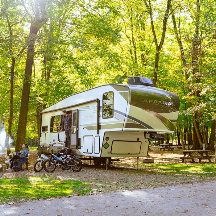 Across the board, smaller fifth wheels are where it's at this year. Alpine’s 100" wide-body 3011CK took a fan-favorite floorplan and cleverly reconfigured the primary suite to add functionality and storage while shrinking the model's overall length. The new bath includes a linen closet with protective 3-sided pull-out shelving, a hidden inline toilet paper dispenser with roll storage, and a pull-out waste can. A new recessed vanity mirror vanity opens up space and is complemented by additional storage in the vanity.