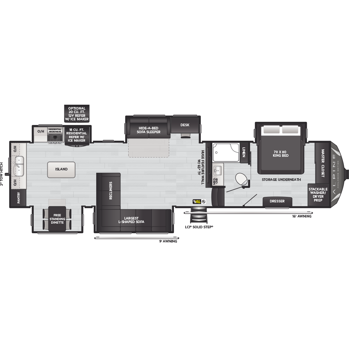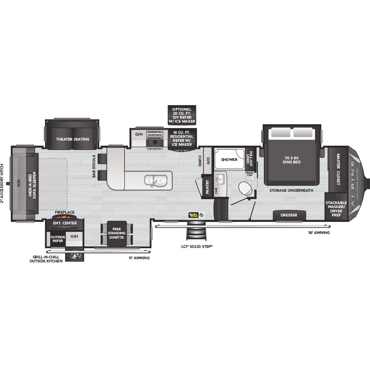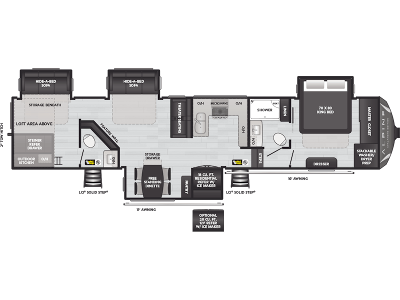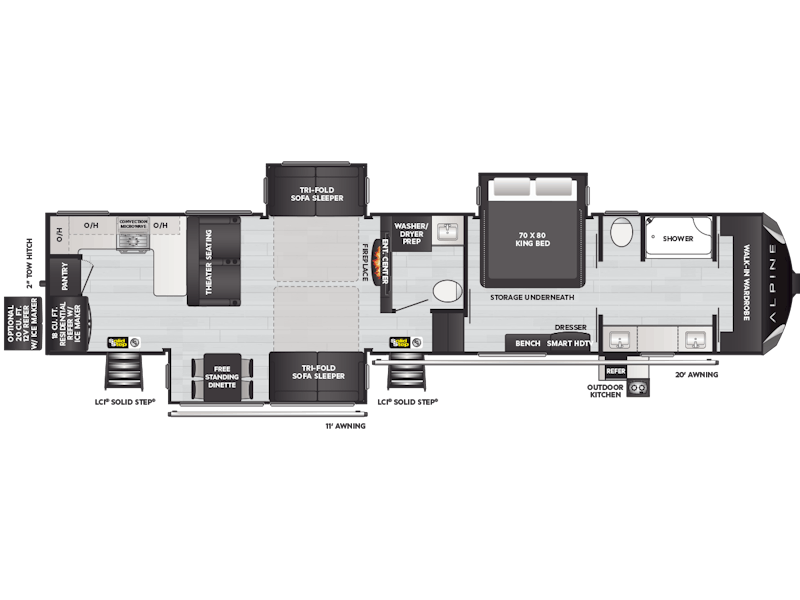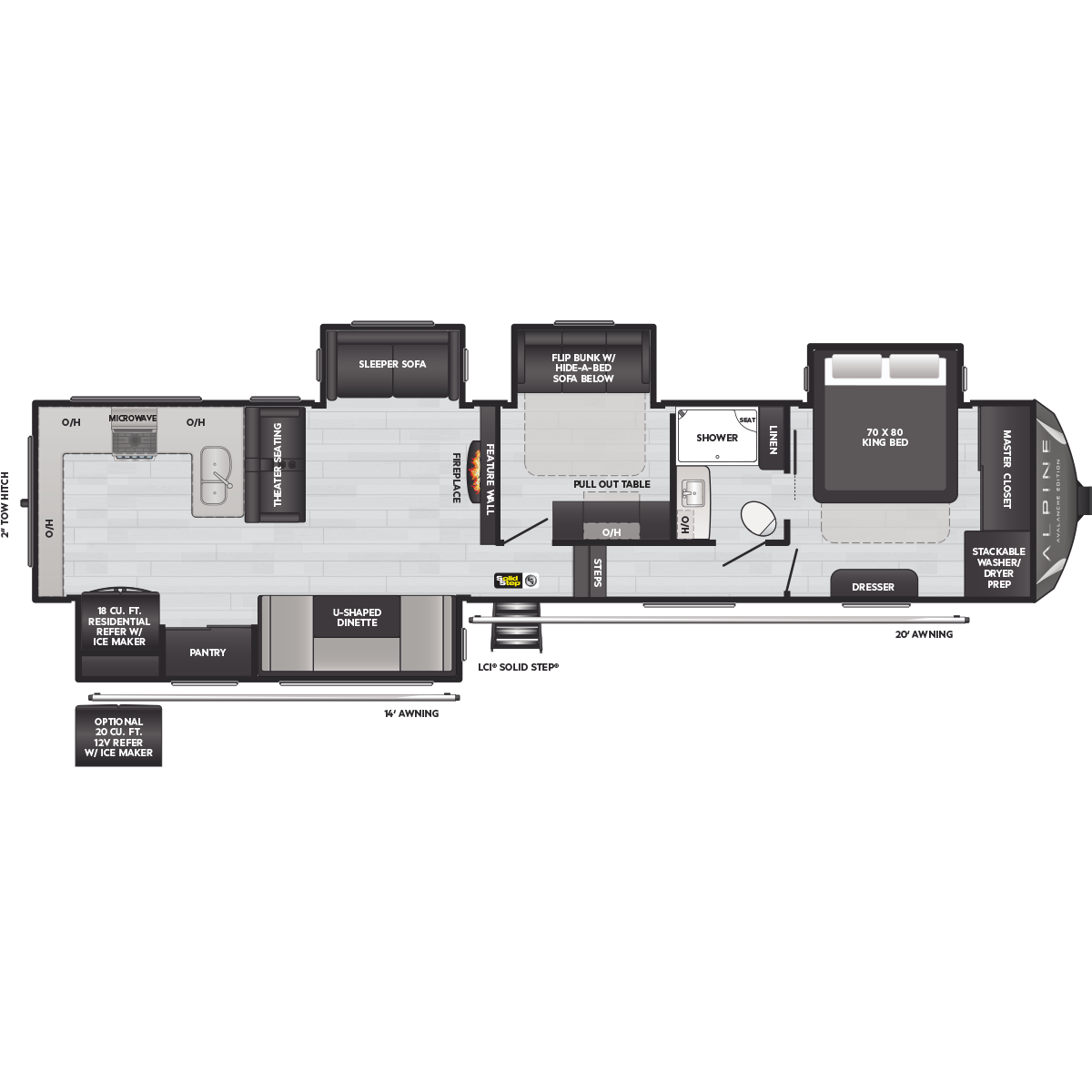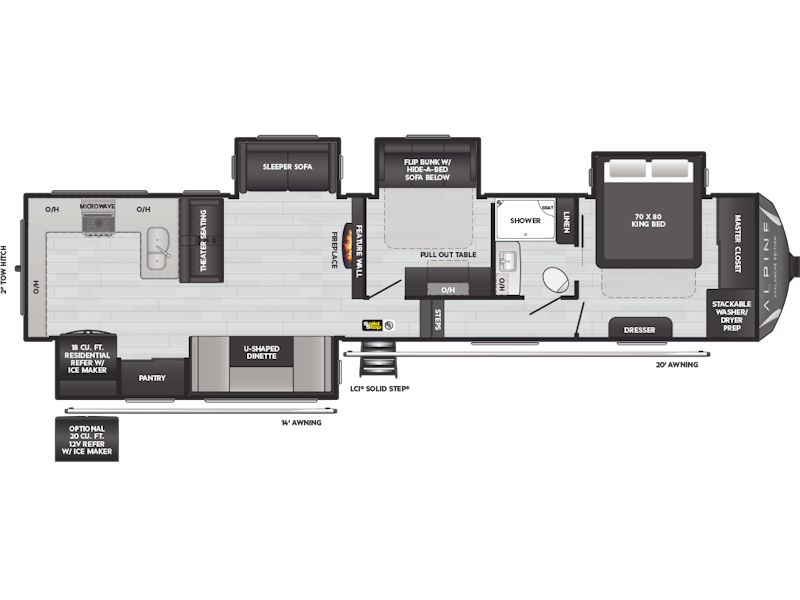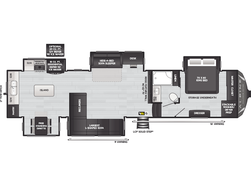 Come to Keystone RV Booth 3 with General RV to see all of these floorplans! Alpine fifth wheel RVs are designed for a new generation of campers who are looking for contemporary styling, unique floorplans, and modern amenities, like on-demand hot water, iN-Command™ smart RV controls, and a powered cord reel. Designed like no other luxury fifth wheel, Alpine RV's offer a residential feel with high ceilings, almost 7' tall slide outs, 100" wide-body construction, and panoramic frameless windows. Alpine stands tall as part of Keystone's legacy of building the finest fifth wheels in North America. All Alpine models are warrantied for full-time travel. Within the Alpine family, buyers have two options: Alpine full-profile models tend to be bit longer with just a few additional luxury features, and Alpine's Avalanche Edition is a favorite for both nomadic families as well as couples.