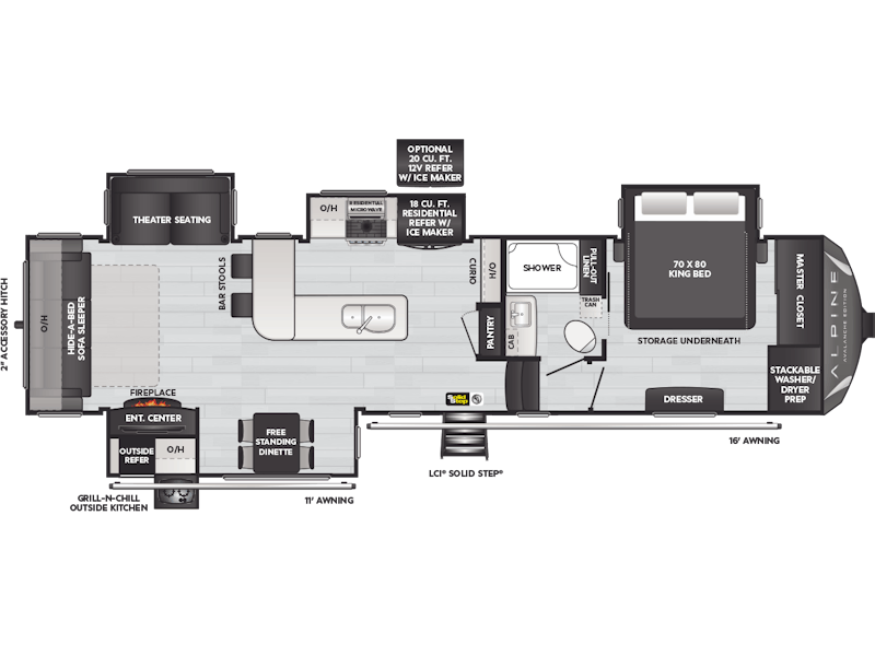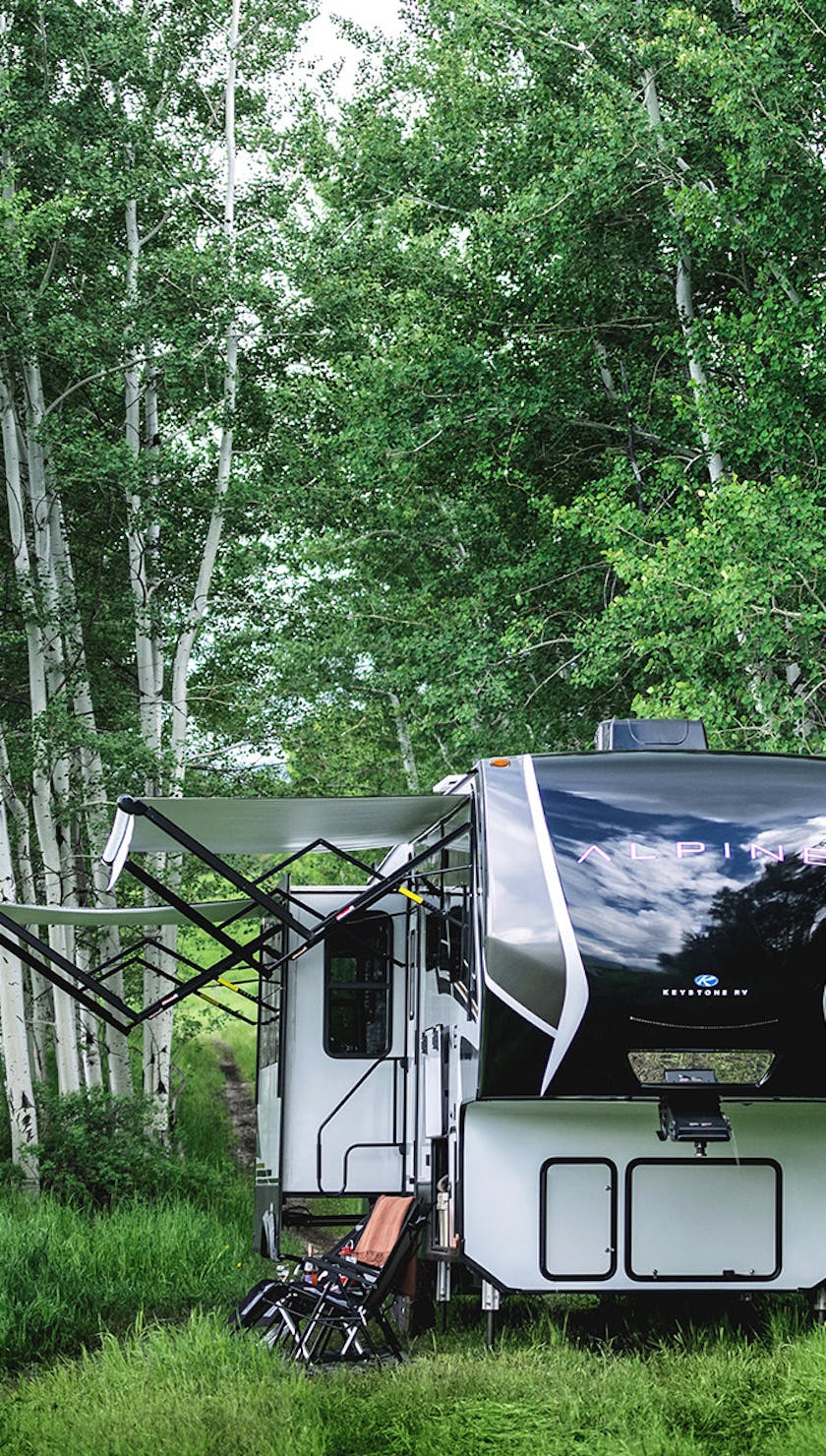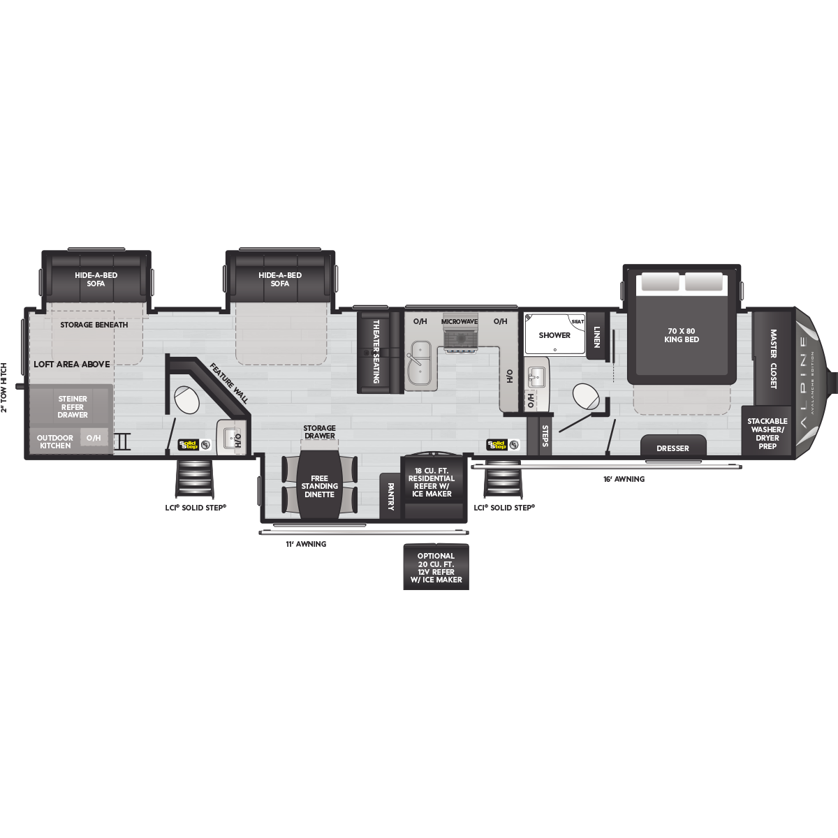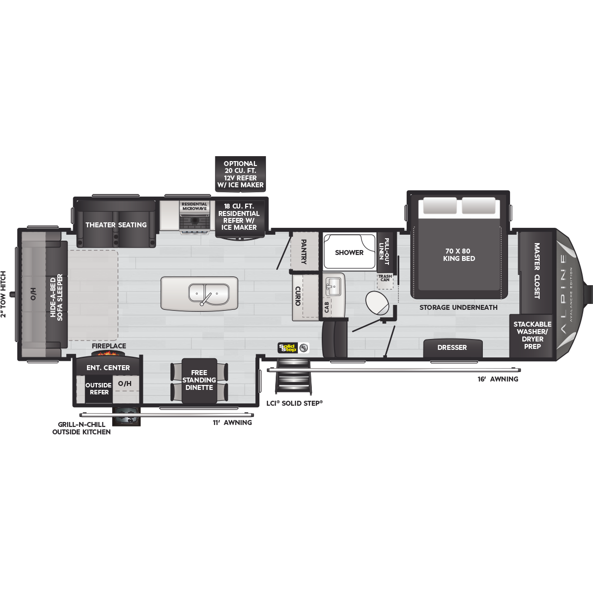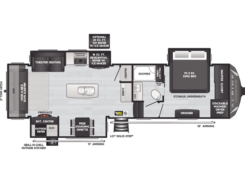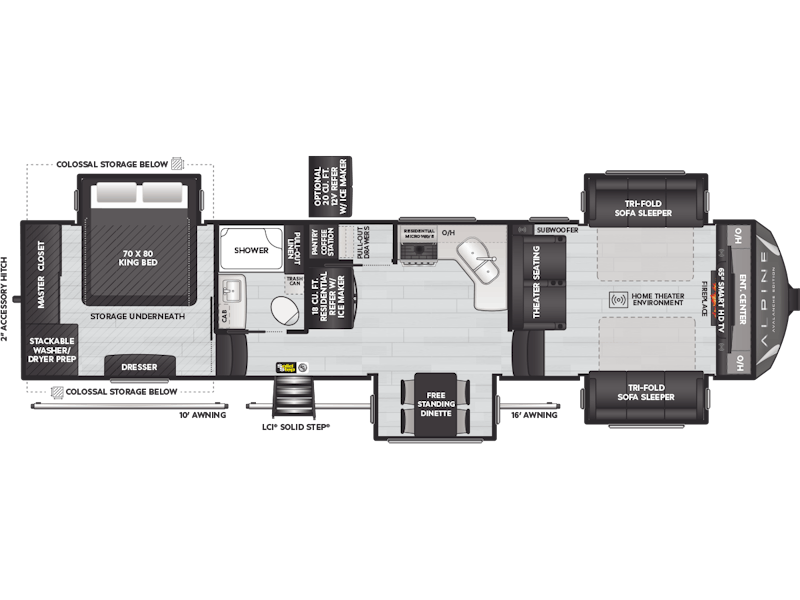 Come to Keystone RV Booth 3 with General RV to see all of these floorplans! Alpine fifth wheel RVs are designed for a new generation of campers who are looking for contemporary styling, unique floorplans, and modern amenities, like on-demand hot water, iN-Command™ smart RV controls, and a powered cord reel. Designed like no other luxury fifth wheel, Alpine RV's offer a residential feel with high ceilings, almost 7' tall slide outs, 100" wide-body construction, and panoramic frameless windows. Alpine stands tall as part of Keystone's legacy of building the finest fifth wheels in North America. All Alpine models are warrantied for full-time travel. Within the Alpine family, buyers have two options: Alpine full-profile models tend to be bit longer with just a few additional luxury features, and Alpine's Avalanche Edition is a favorite for both nomadic families as well as couples.