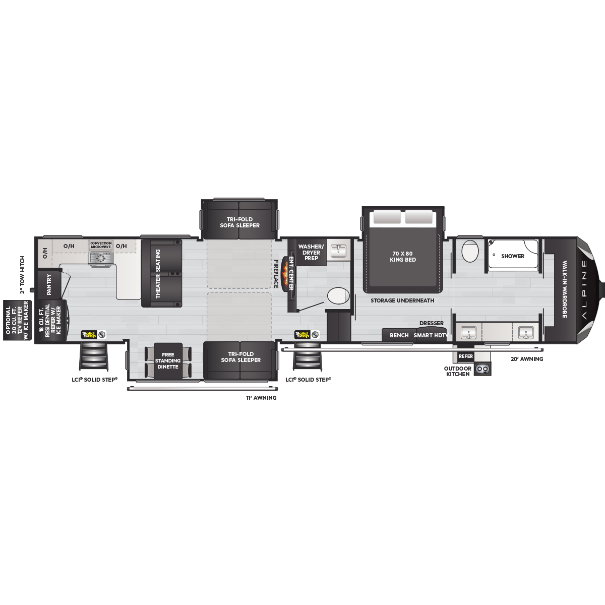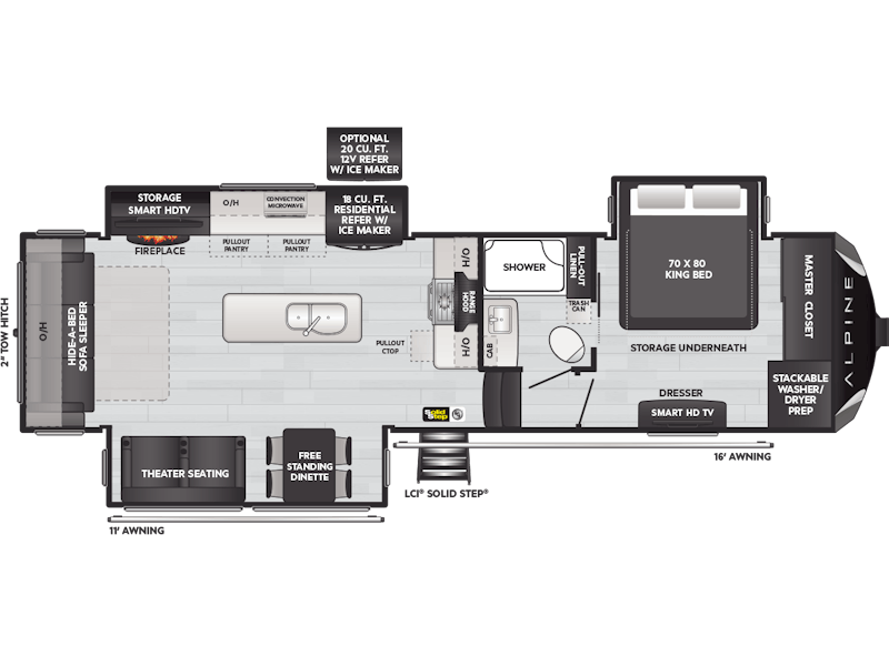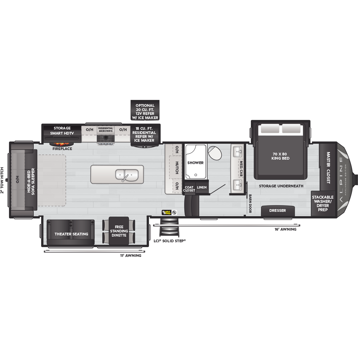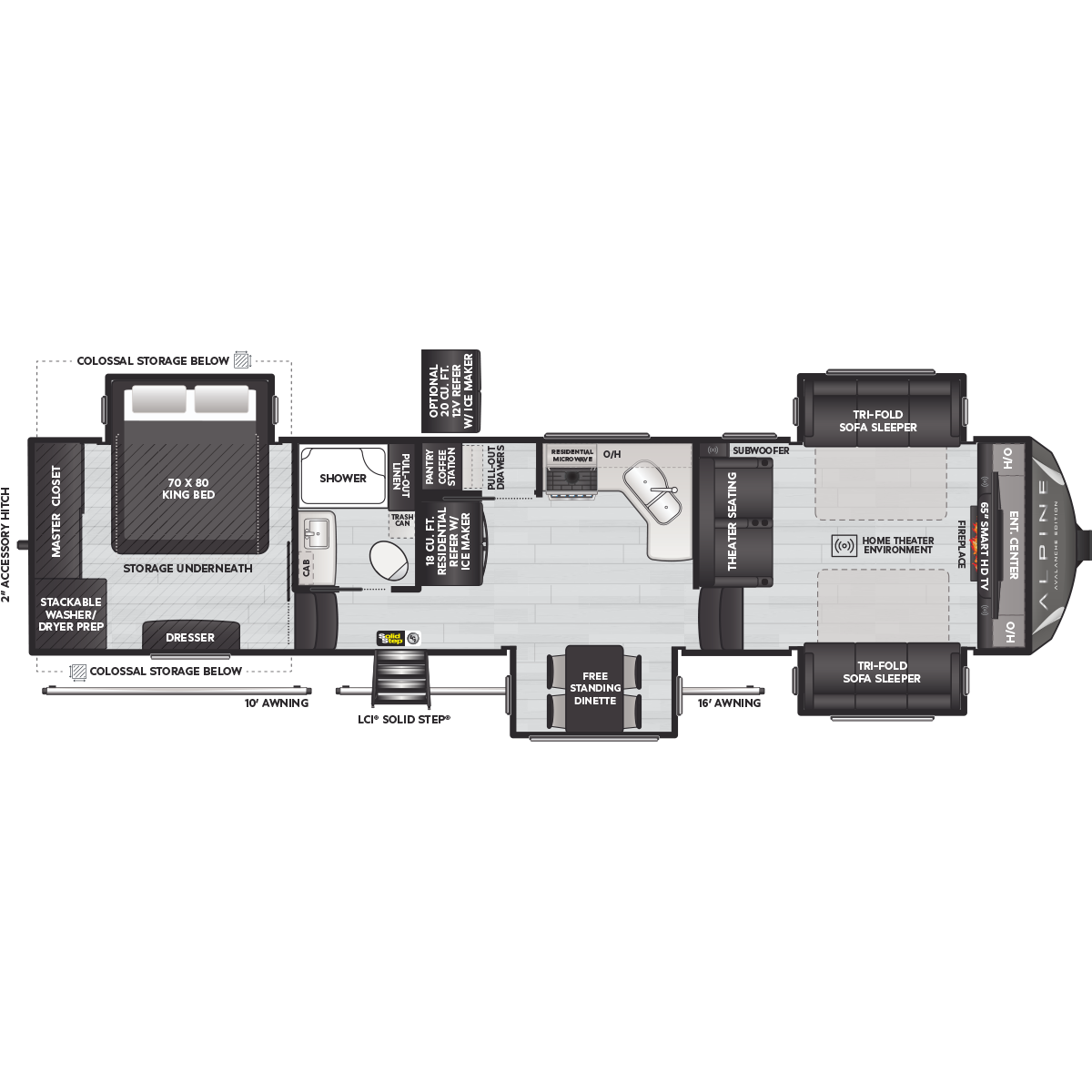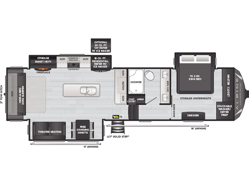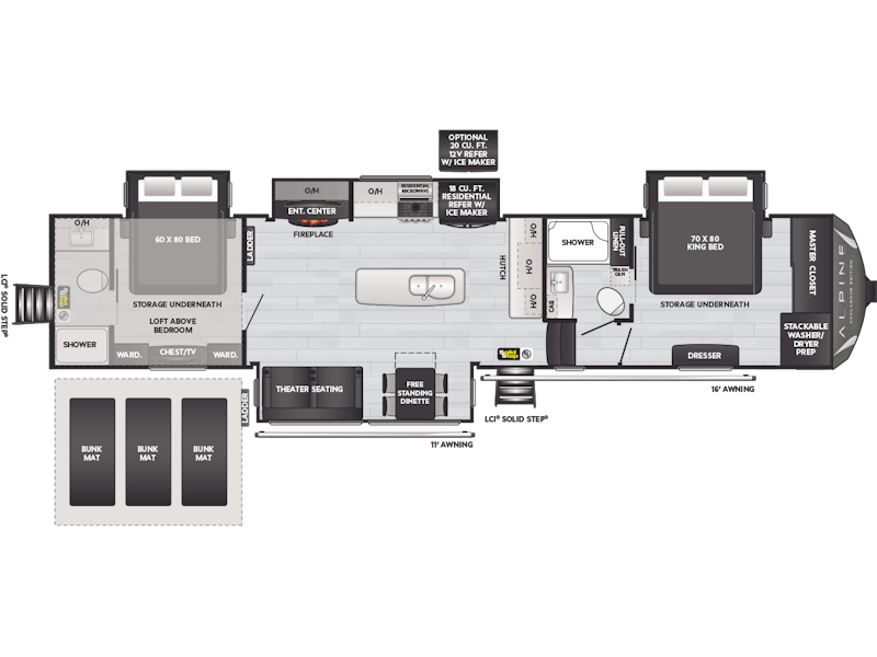 Come to Keystone RV Booth 3 with General RV to see all of these floorplans! Alpine fifth wheel RVs are designed for a new generation of campers who are looking for contemporary styling, unique floorplans, and modern amenities, like on-demand hot water, iN-Command™ smart RV controls, and a powered cord reel. Designed like no other luxury fifth wheel, Alpine RV's offer a residential feel with high ceilings, almost 7' tall slide outs, 100" wide-body construction, and panoramic frameless windows. Alpine stands tall as part of Keystone's legacy of building the finest fifth wheels in North America. All Alpine models are warrantied for full-time travel. Within the Alpine family, buyers have two options: Alpine full-profile models tend to be bit longer with just a few additional luxury features, and Alpine's Avalanche Edition is a favorite for both nomadic families as well as couples.