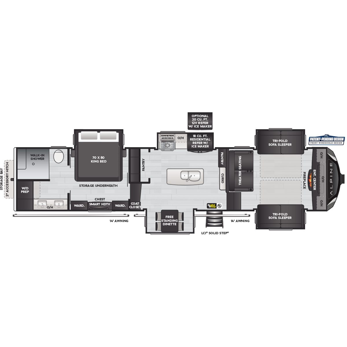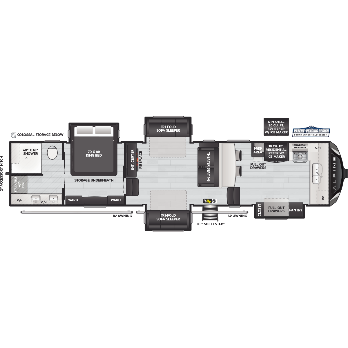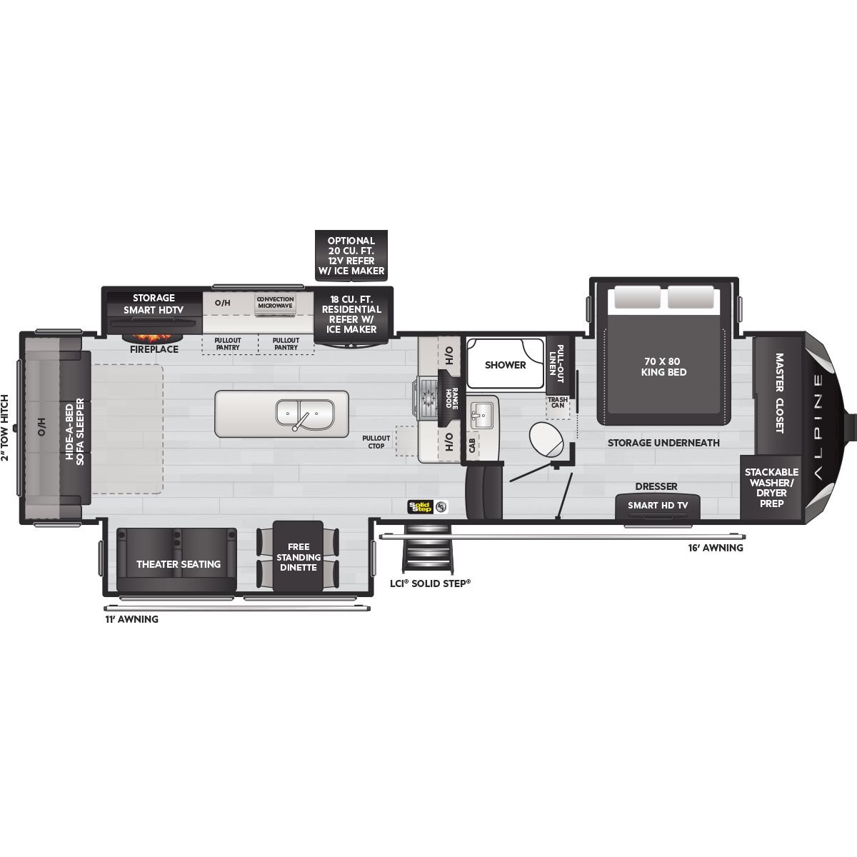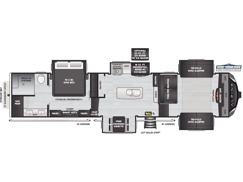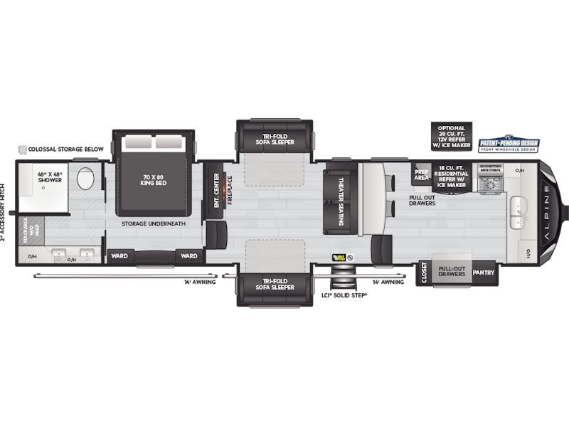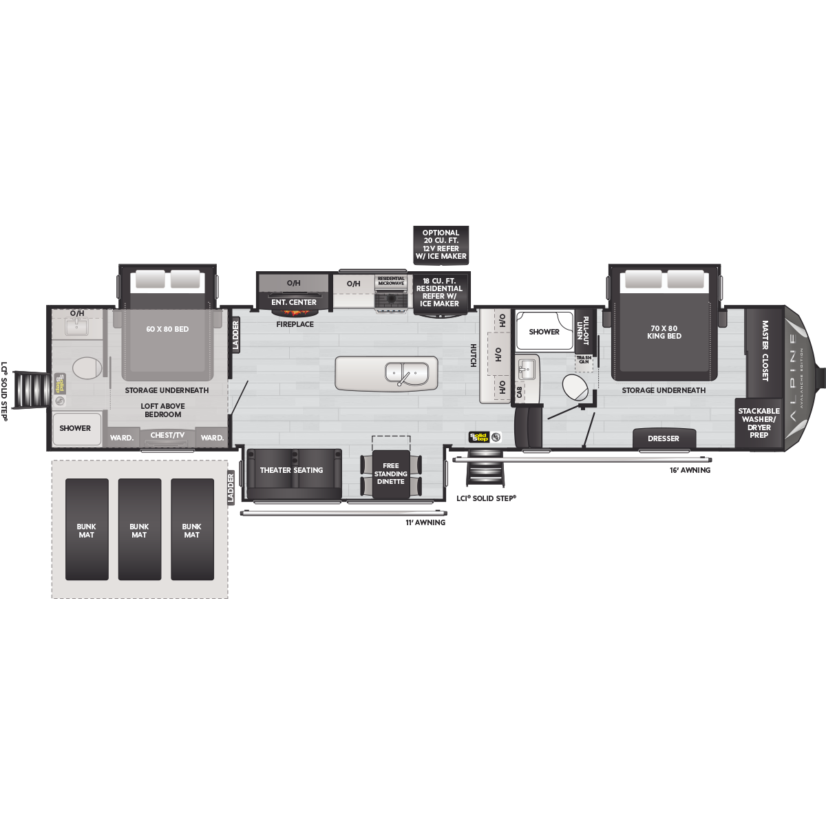 Come to Keystone RV Booth 3 with General RV to see all of these floorplans! Alpine fifth wheel RVs are designed for a new generation of campers who are looking for contemporary styling, unique floorplans, and modern amenities, like on-demand hot water, iN-Command™ smart RV controls, and a powered cord reel. Designed like no other luxury fifth wheel, Alpine RV's offer a residential feel with high ceilings, almost 7' tall slide outs, 100" wide-body construction, and panoramic frameless windows. Alpine stands tall as part of Keystone's legacy of building the finest fifth wheels in North America. All Alpine models are warrantied for full-time travel. Within the Alpine family, buyers have two options: Alpine full-profile models tend to be bit longer with just a few additional luxury features, and Alpine's Avalanche Edition is a favorite for both nomadic families as well as couples.