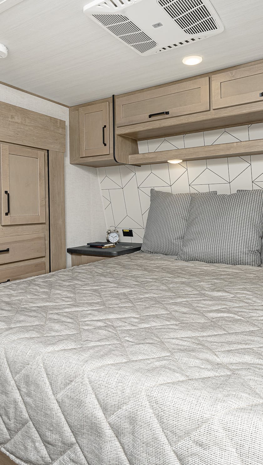 A comfy place to sleep is a must when it comes to camping! Cozy up in the Carbon 358 and while you're at it, bring whatever you want because there's no lack of storage. There's a massive wardrobe, above-bed storage, AND nightstand storage on both sides of the bed. Comforts of home are woven into the bedroom and bathroom with built-in wireless phone chargers on each nightstand, a geometric headboard, and a complete fiberglass shower surround with glass sliding doors. Your DREAM vacay is waiting, take a look!