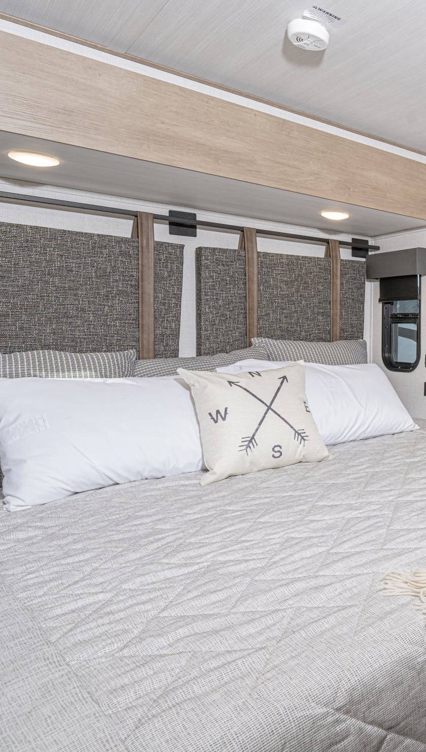 We love a good couples coach with a cozy bedroom. The Bullet Premier 25RKPR features a residential queen-sized bed, tons of storage including dual wardrobes, pillow side shelving on both sides of the bed (the perfect place to rest your phone, a good book, or a CPAP machine), built-in drawers, a laundry chute to the passthrough storage, overhead storage, AND another closet! You can bring anything that you want for your weekend or week-long adventures.