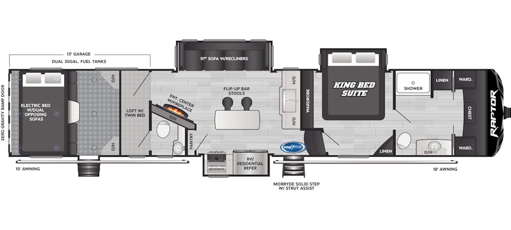 Are you looking for a dream bedroom and bathroom combo in a toy hauler? Look no further! The Raptor 420 features a massive front bathroom combined with a walk-in closet that is connected to the main bedroom with a large king bed and an entire storage wall. The bedroom also features a built-in corner linen cabinet and a mounted TV to bring you all of the comforts of home. New for 2023, a decorative headboard brings this bedroom to a whole new level. Don't just take our word for it, check it out below!