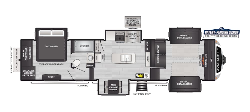 All the cozy vibes in this Avalanche 360FL , a front living floor plan that is brand new for 2023. Around 40', this model sleeps up to 6 people and has a huge master suite with a private bath. The bedroom has SO much storage, and a bench in the wardrobe so you can comfortably sit while putting on your shoes. The best part? It's prepped with a stackable washer and dryer to make the laundry process while being out on the road that much easier.