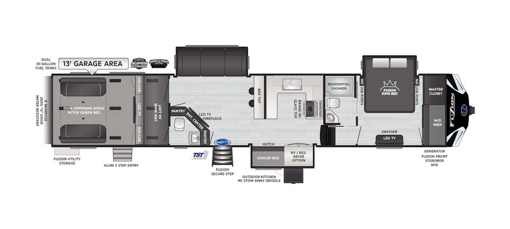 This Fuzion 421 floorplan gives owners not only a large 13 ft garage but an open concept living and kitchen space. The u-shaped kitchen is built for a chef, is spacious with plenty of cabinetry, counter space, and built-in bar stools for 2 people. The cozy entertainment space includes a fireplace and TV angled directly across from the sofa. This floorplan is brand new for 2023 and checks all of the boxes for those who want to bring their toys but don't want to compromise on living space.