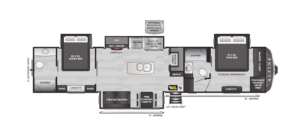 The Alpine 3912DS is a double-suite floor plan that is truly one of a kind. With a grand kitchen, two awnings, and stackable washer and dryer prep, this is for the experienced camper who loves the glamping life. The walk-in pantry in the kitchen is just one of the many things that shows off this modern model that sleeps up to six people-- and all around 43'. Deciding between décor options of Stanton or Easton will be one of the hardest choices to make when the interior already feels so refreshed and new. With an amazing amount of storage and endless comfort options, it's easy to see why this new Alpine model has had such a massive following already.