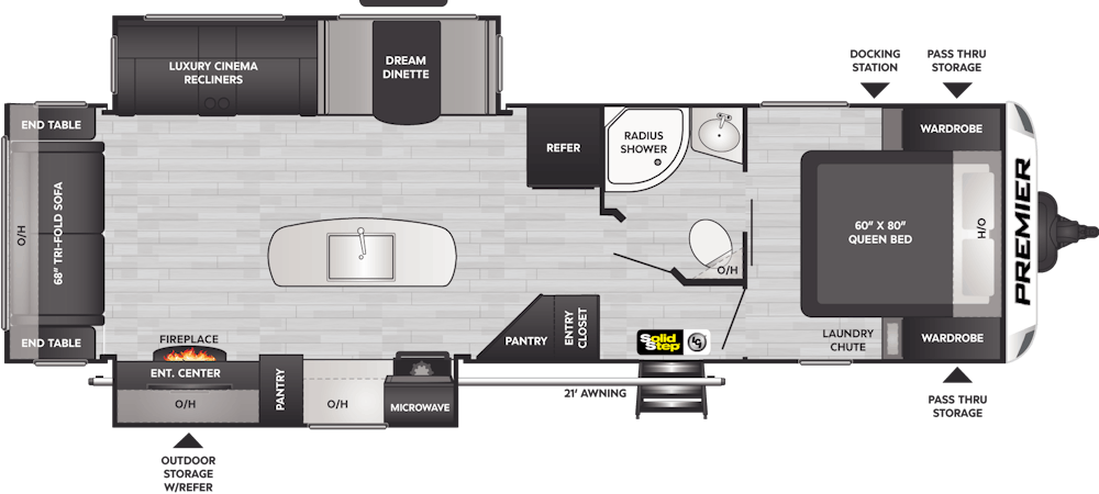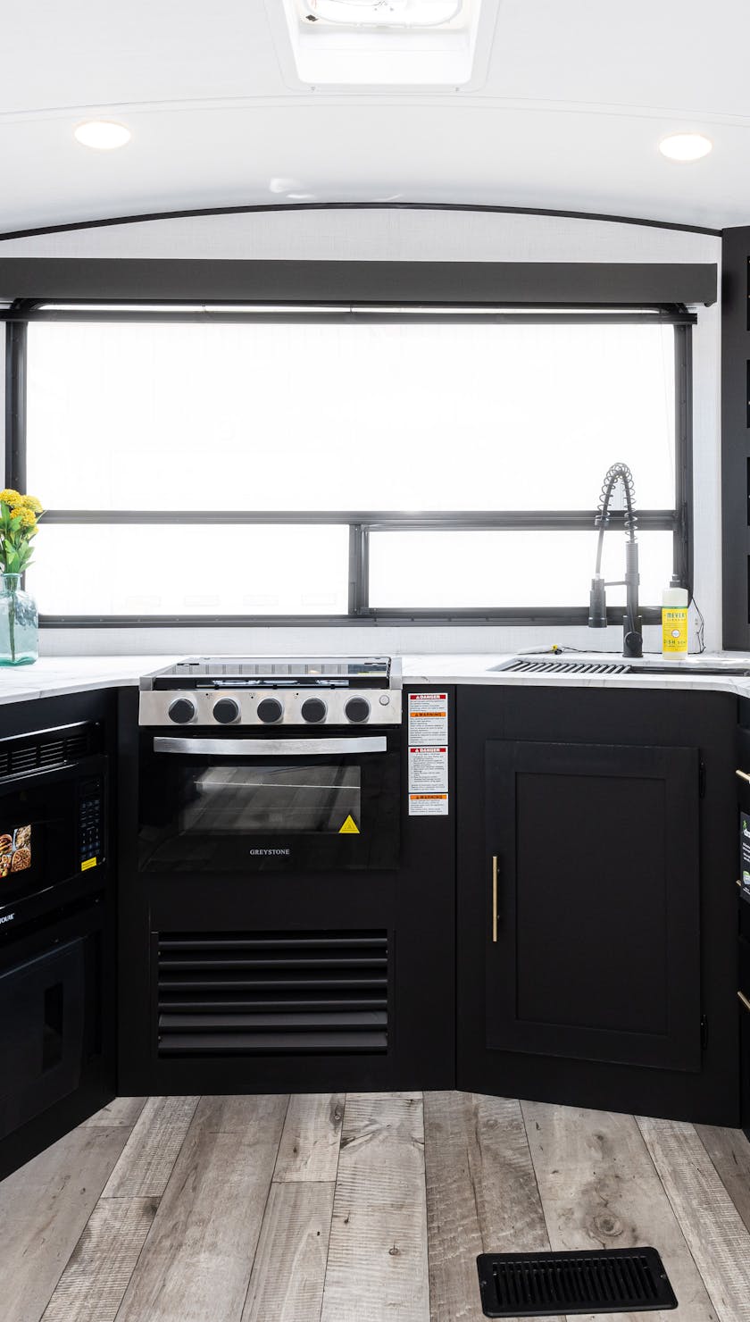 A luxury chef's kitchen in a less than 36 ft package? Yes please! The Bullet Premier 30RIPR is less than 7500 lb and boasts an amazing open concept kitchen and living space. Plenty of counter space gives owners tons of prep space. Gorgeous solid surface countertops, a high rise faucet, a stainless steel single basin sink, along with ample storage seal the deal on this couple's coach. Make sure that you take a look!