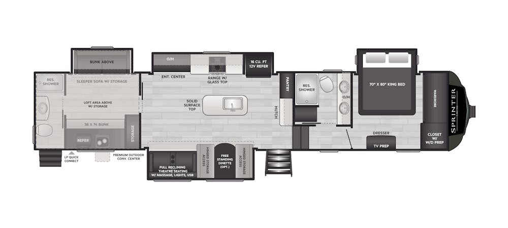 The Sprinter 3900DBL is a double bath bunkhouse with SO much storage--about 68 cubic feet from front to back. The kitchen itself is impressive with plenty of room to put everything you need, a beautiful island design, all near the living space featuring 100" wide body construction and tall windows that open all the way throughout.