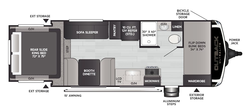 The unparalleled luxury, style, and comfort of Outback Premium in smaller, ultra-lightweight floorplans, the Outback Ultra-Lite Travel Trailer provides exceptional towing experience. In the 210URS, the flip down bunk beds double as sleeping space and additional storage maximizing your space on the road. You'll want to make sure to check out the king-sized bed and slide in this model which offers more walkaround space in the bedroom than most travel trailers of its size.