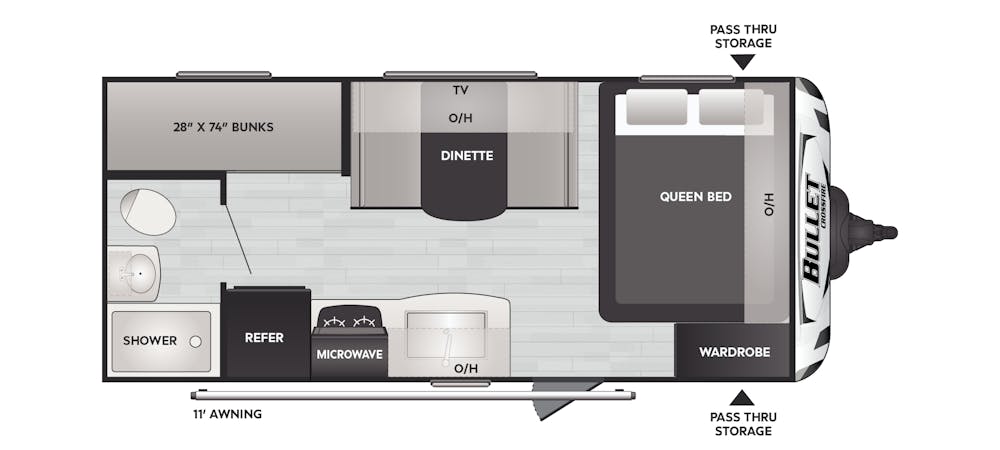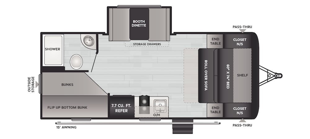 Not as common in single-axle models, the Hideout 181BH features a single slide expanding the living space within the coach providing enough space for the whole family. With a sleeping capacity of 6 between the bunks, booth dinette, and queen bed, you'll want to check out this floorplan for your family adventures.