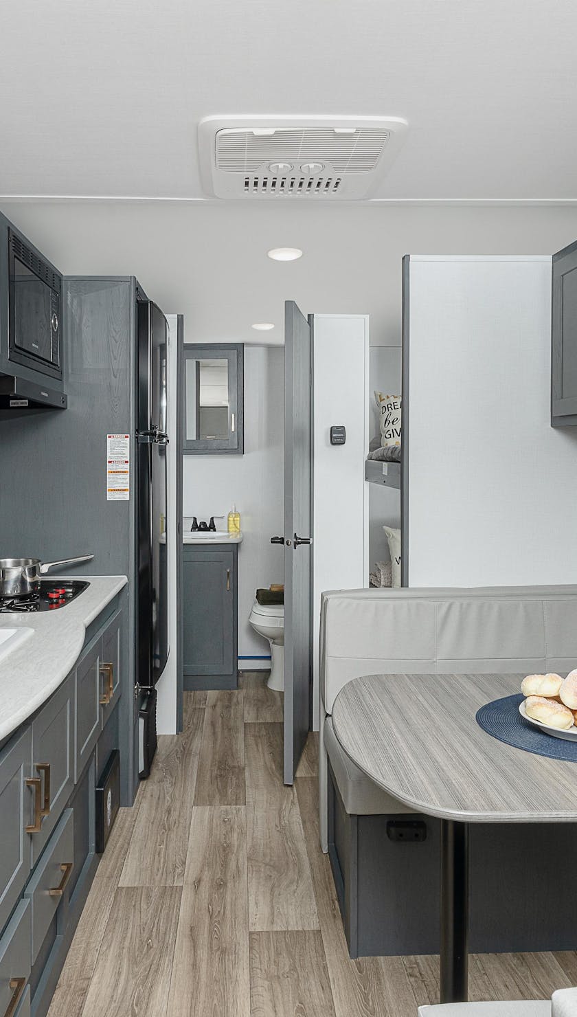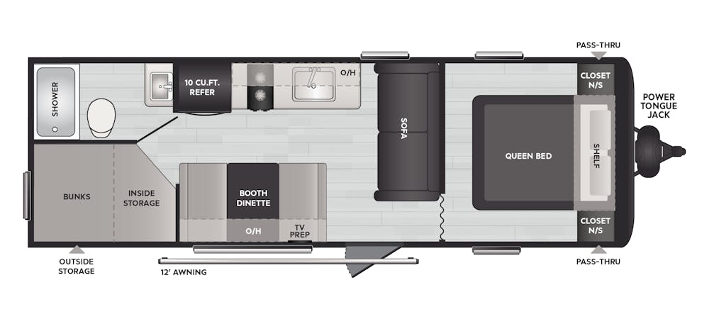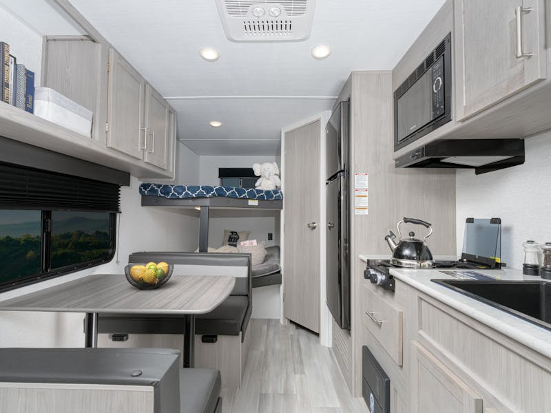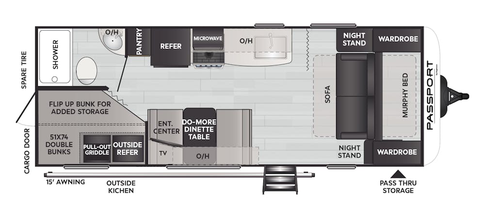 Passport SL is super light, and super fun! The double bunk flips up providing additional storage just on the other side of the outdoor kitchen with a pull-out griddle and refrigerator. What more could you need? The best family bunkhouse for 2024!