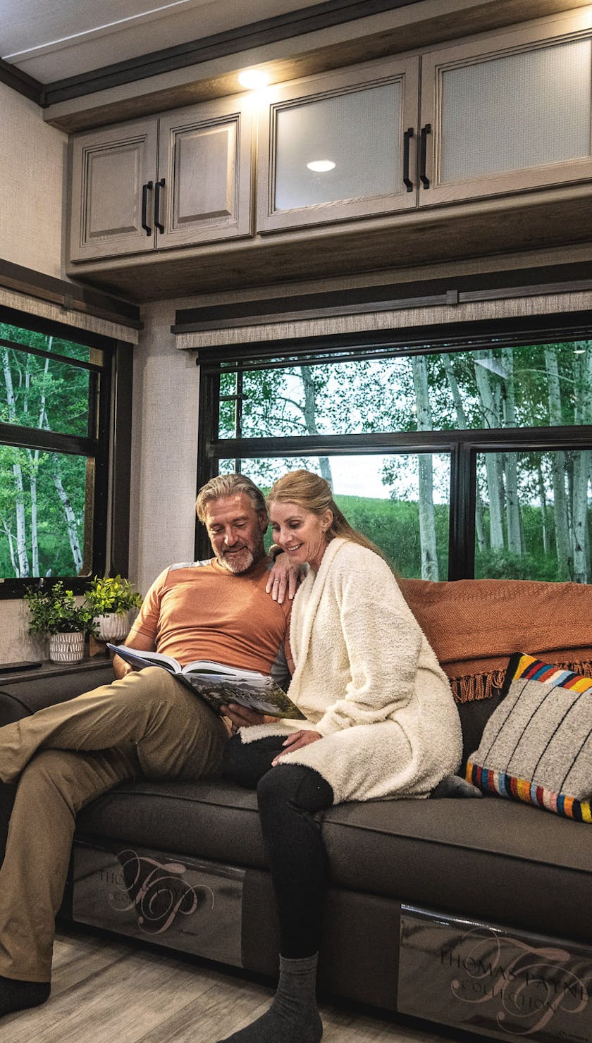 Down in the living area, owners can kick their feet up and relax after a long day. The space is complete with two sleeper sofas and theater seats that are directly across from the TV. Up to eight people can enjoy the big game or have a movie night together.