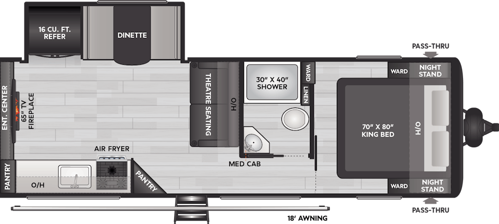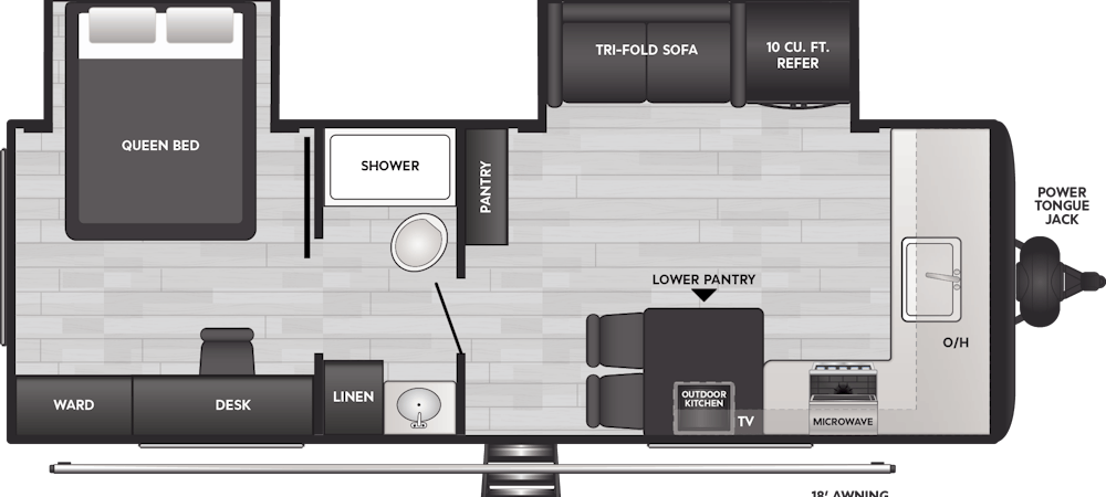 One of Hideout’s most exciting new floorplans is the 24FKS, designed for campers who want to hit the road with ease and comfort. Featuring a bed slide, you’ll have additional space with this walkaround queen bed. The full desk and chair in the bedroom also add a nice touch, allowing you to take your work wherever your adventure leads. The walkthrough bathroom leads you into the front kitchen layout with a wraparound countertop, giving you ample counter space for your kitchen appliances or additional storage. With the bar stools at the counter and a lower pantry, this open concept provides campers with all the space for entertainment. Finally, on the exterior of the unit, campers will enjoy the option to cook in the outdoor kitchen, a feature not commonly found on couple’s coaches.