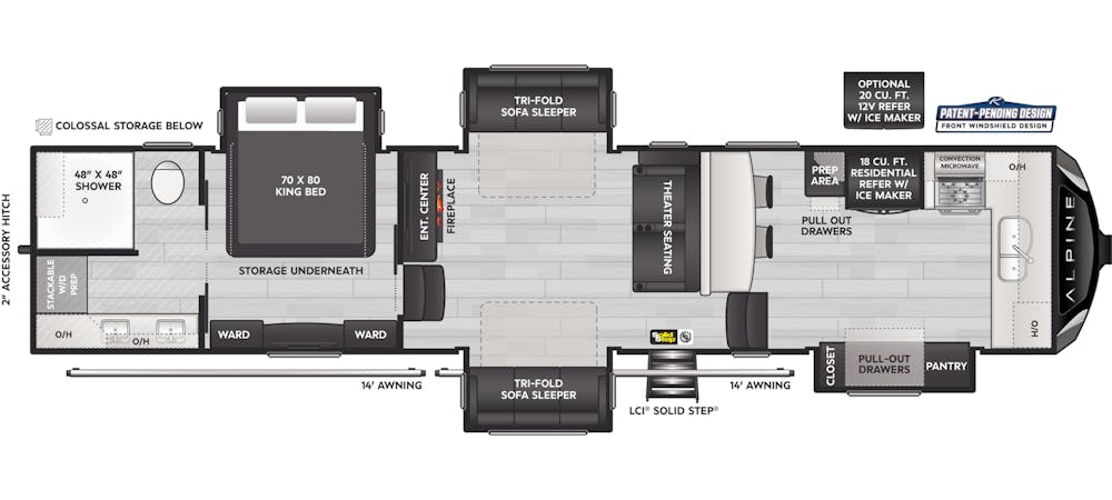Introducing the Alpine 3820FK, an open-concept front kitchen floorplan. We’ve learned from engaging with customers at shows and owner’s rallies that not every owner wants an island so we took that feedback and created the 3820FK but we did it in a way that owners don’t have to sacrifice storage or counterspace. The large pantry slideout is equipped with functional sliding drawer storage making getting to the back of the pantry much easier, this area also includes additional counter space that is perfect for housing a coffee maker.