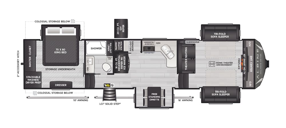 At 38'11" in length, the stunning brand-new Alpine Avalanche Edition 346FL is packed with features that will elevate your RVing experience. You'll never run out of space for your essentials because this floorplan maximizes storage both inside and outside.