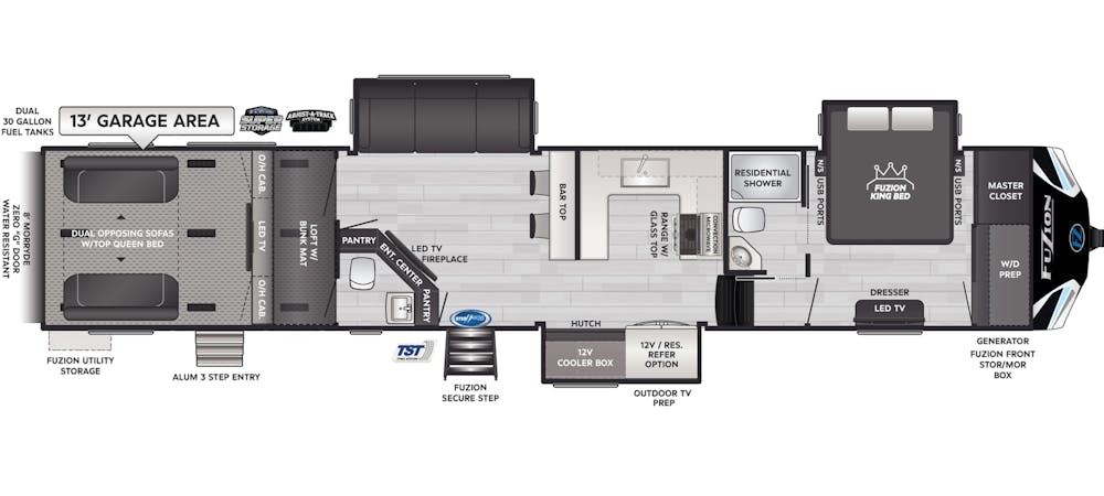 With a 13 ft garage that can be used to haul or flex space, the Fuzion 421 is a great floorplan for adventure seekers. Welcome to the ultimate party toy hauler, with a great kitchen for entertaining, a massive sofa with heat and massage functions, panoramic views from the garage and patio, and king king-sized bed.