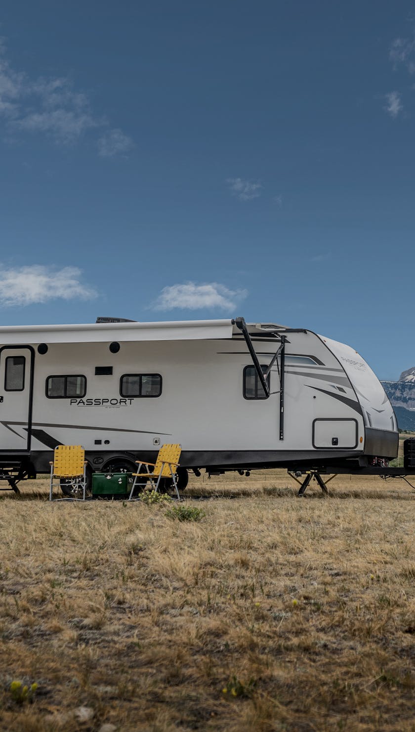 Next on the list is the Passport 22BH. Less than 25 ft in length and under 5,500 lbs, this bunkhouse has everything that you'll need for a family adventure. Complete with an outdoor kitchen, double over double rear bunks, a rear cargo door that is perfect for bike storage, a large pantry, a u-shaped dinette, and a queen-sized murphy bed, this floorplan gives owners great amenities in a lighter package. Known as the "Swiss Army Knife of RVs," Passport maximizes every square inch of storage space, with great exterior and interior storage, the entire family can easily bring whatever they want and still have space for more.