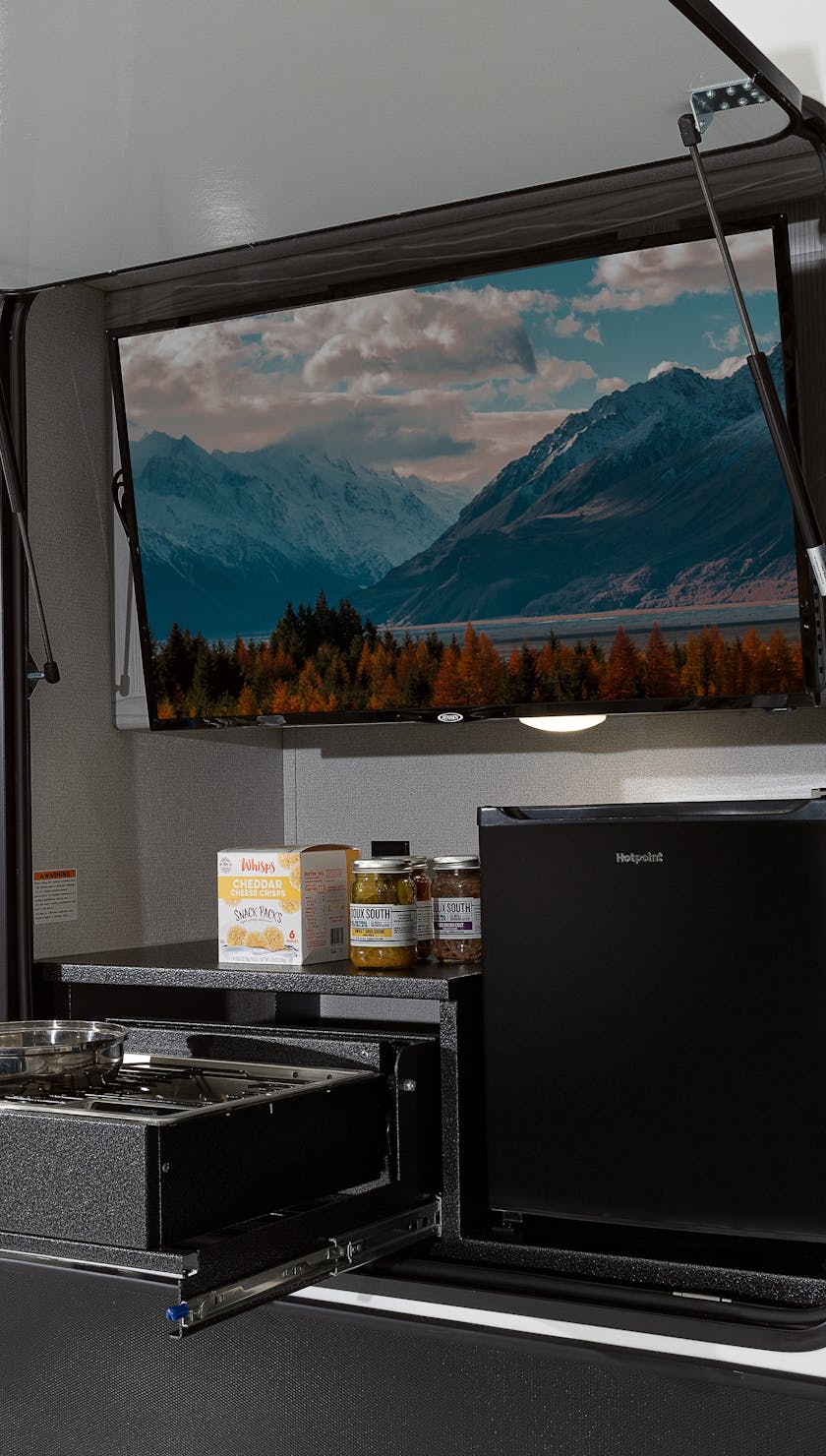 Outdoor living is where it's at in Sprinter's 31TB fifth wheel. This wide-body beauty not only has a camp kitchen with a food fridge and griddle, it has a second beverage fridge just steps away! All of this is covered by a 20' awning for primo campsite entertaining. And if it couldn't get better, the 31TB has an oversized exterior storage compartment for storing camp chairs and corn hole boards. Check it out for yourself!
