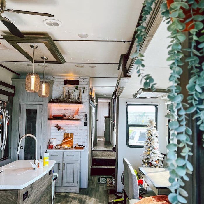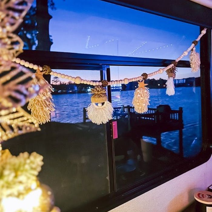 This brings me to my next point! REPURPOSE! What do you have around the RV that you can repurpose? For me, it was these garland beads and twinkling string lights. I had just enough to bring in that sparkle on the ceiling!