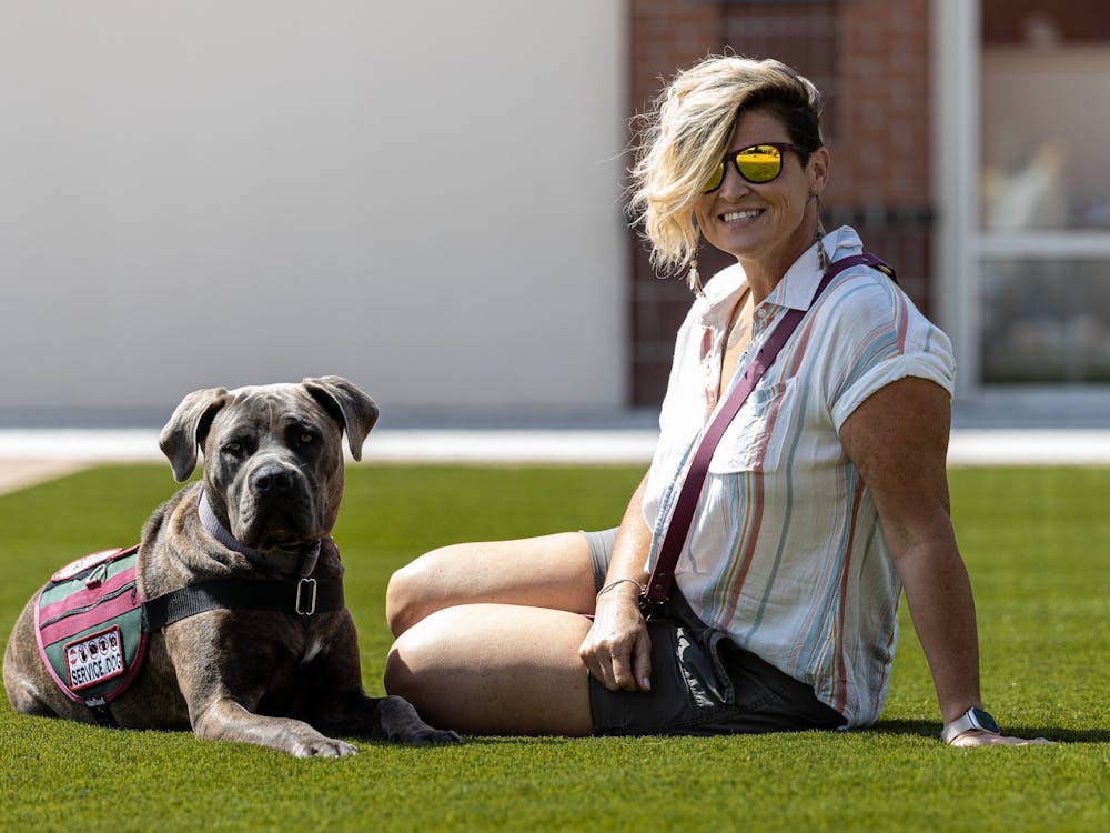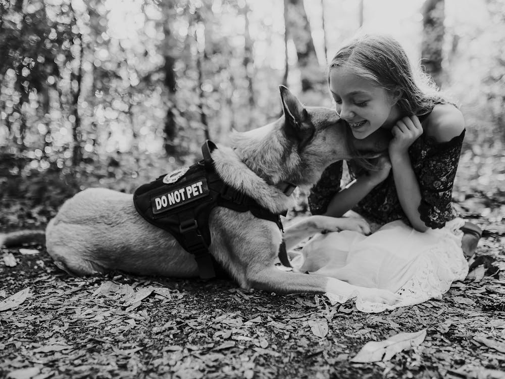 Having a history of PTSD and TBI, I can have episodes of anxiety and panic attacks as well as difficulty with memory, vision, and balance. Having a service dog has directly impacted my ability to confidently maneuver daily life skills such as going to the grocery store, dining, and general social situations. Giavanna is trained to assist with keeping me protected during panic attacks and to de-escalate those situations. She assists with balance and maneuvering when I am having difficulty. This doesn’t mean it is all work and no play. She is spoiled rotten. Giavanna is a bandana model, a baseball catcher, an award-winning stuffed animal locator, and world champion drool monster." - Kimberly