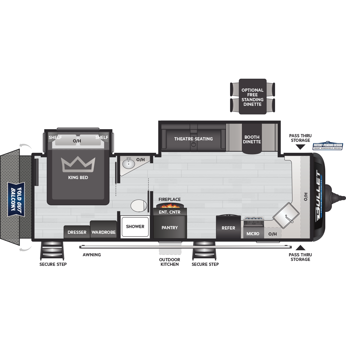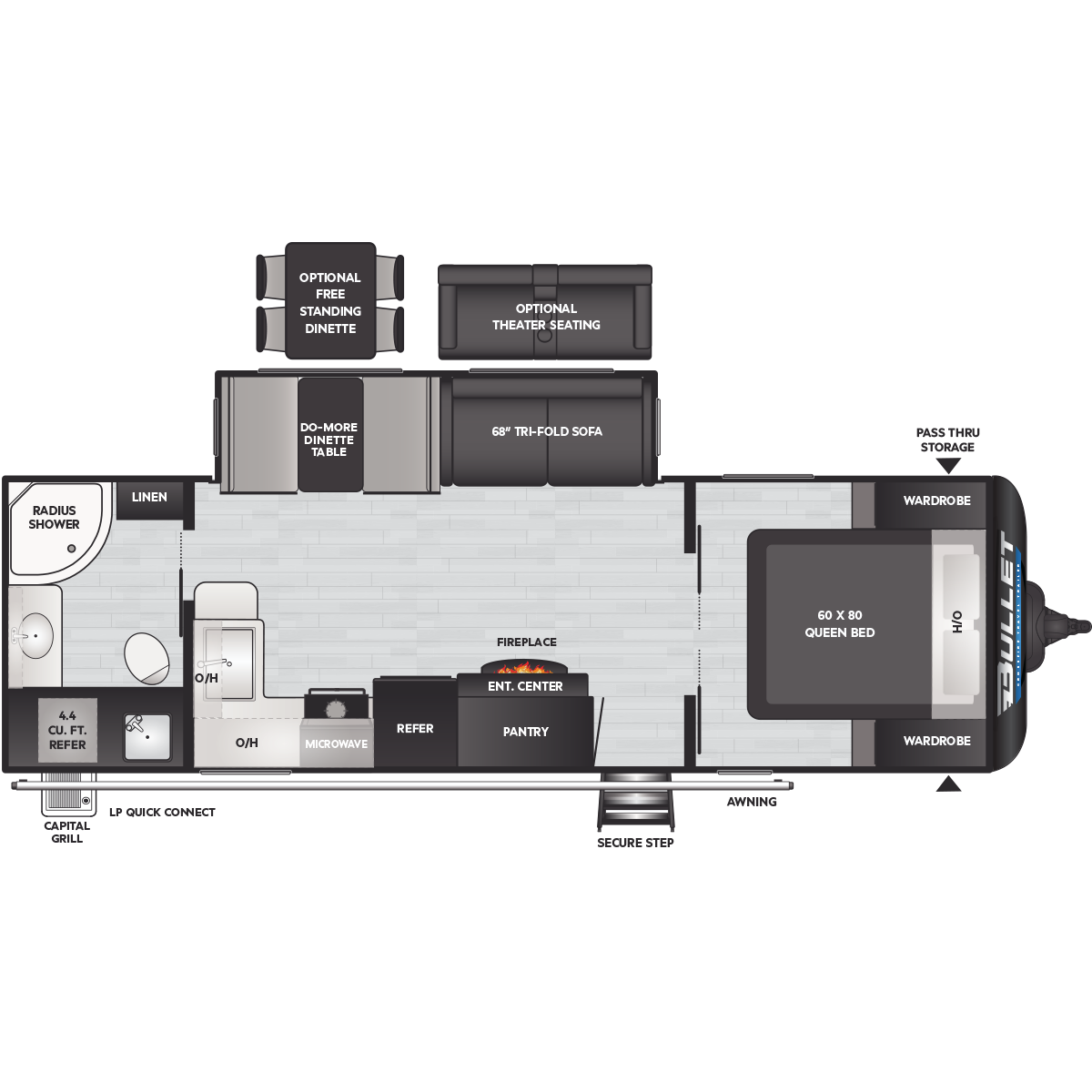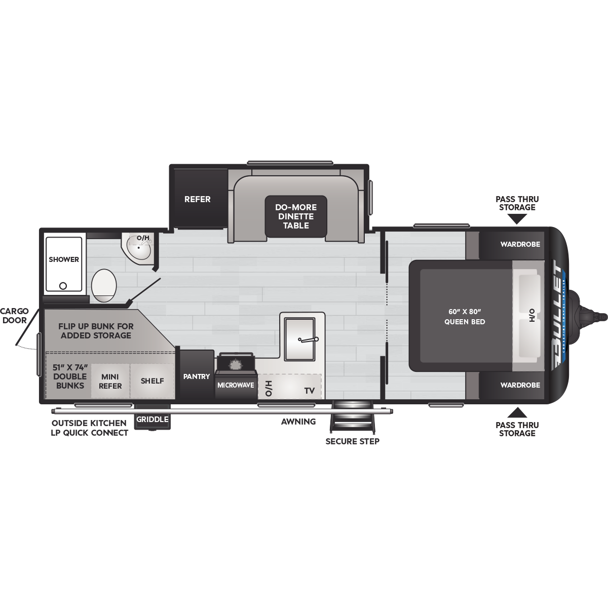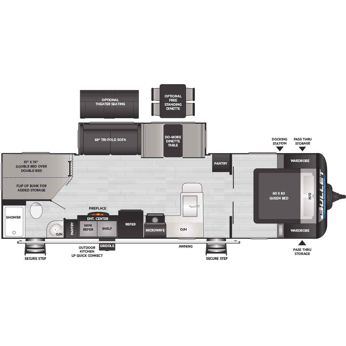 Come to Keystone RV Booth 2 with Camping World to see all of these floorplans! Discover a new era of RVing with Bullet and Bullet Crossfire Ultra-Lite travel trailers – your gateway to towing confidence, unparalleled style, and versatility. Explore a world where towing becomes effortless, where sleek design merges seamlessly with functionality, and where your journey is only limited by your imagination. Bullet’s main product line offers distinctive bunkhouses and couples coaches with more features and amenities. Bullet Crossfire includes smaller, single- and dual-axle models designed with comfort and affordability in mind. Your path to unforgettable adventures starts here, with RVs that not only reflect your style but enhance every moment of your travel.
