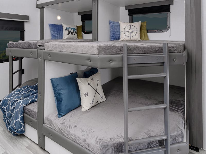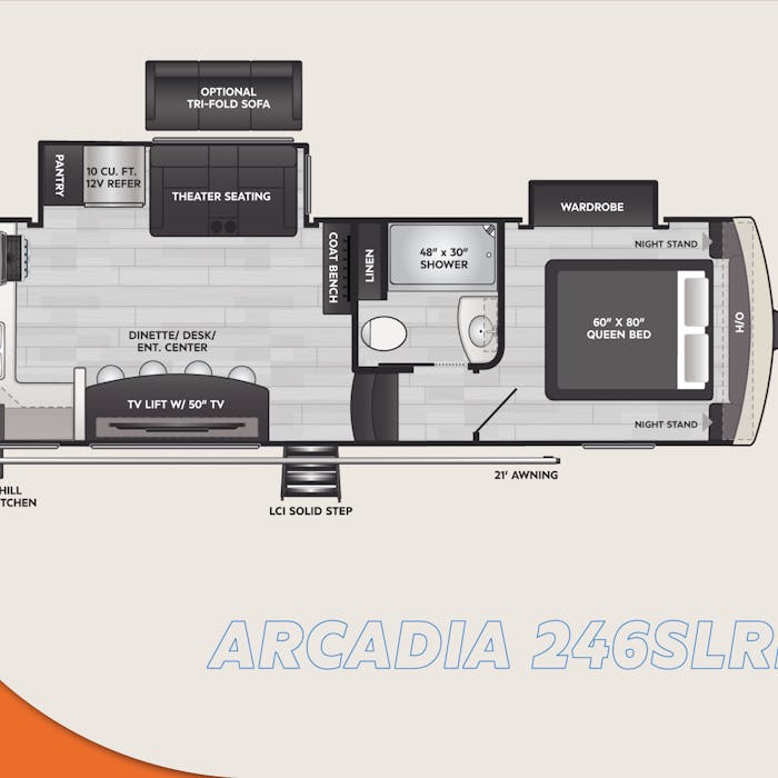 The Arcadia Super Lite 246SLRK, under 29 feet, is an ideal choice for couples or solo adventurers exploring state and national parks. Its rear kitchen offers panoramic views and ample storage, featuring a versatile dining table that doubles as a comfortable workspace. Upstairs, a spacious bathroom includes a 48" shower, while the bedroom boasts a queen-sized bed, built-in nightstands, and ample storage, making it a comfortable and flexible choice for those seeking limitless adventure.